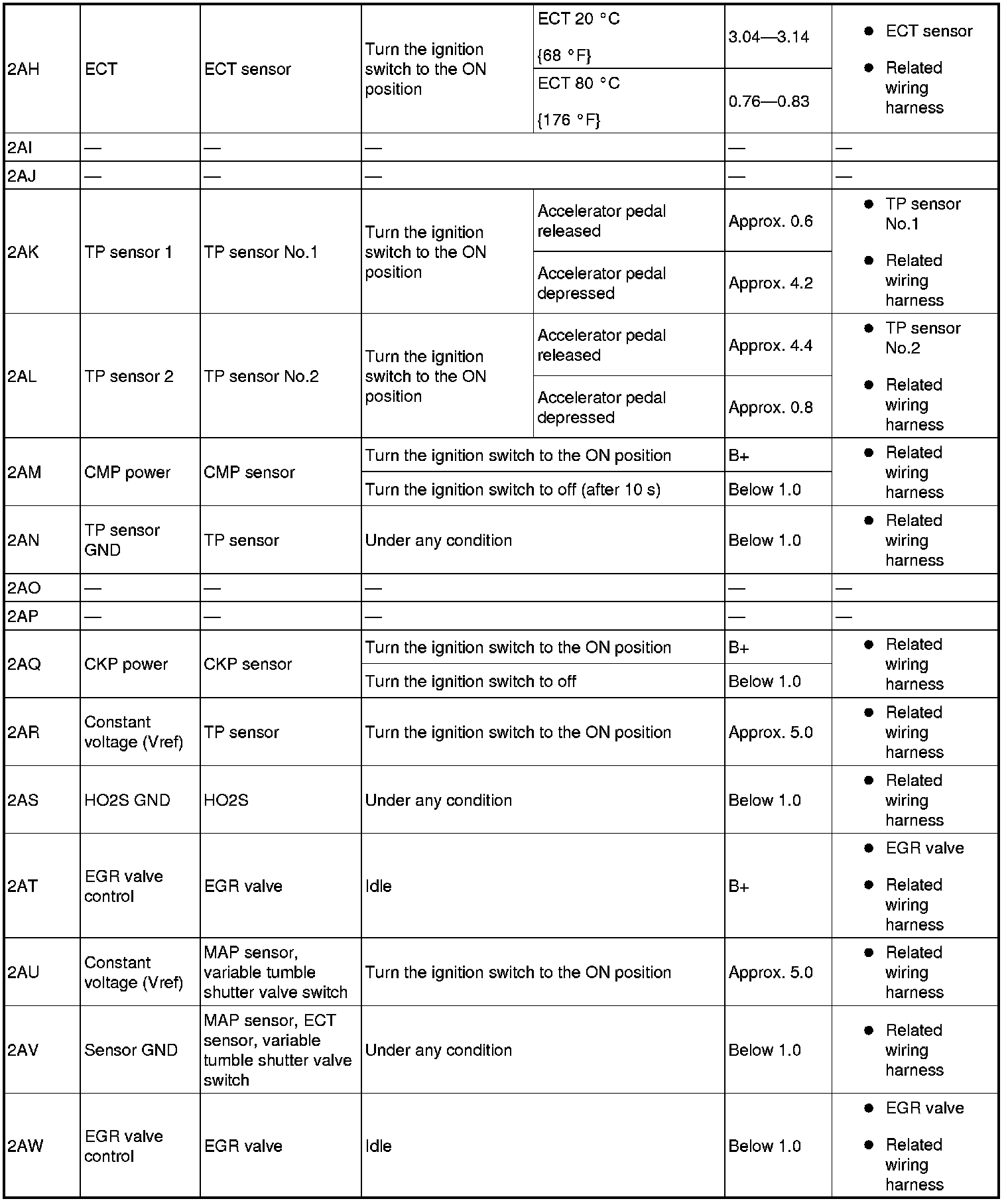 - The PCM terminal voltages vary with change in measuring conditions and vehicle conditions. Always carry out a total inspection of the input systems, output systems, and PCM to determine the cause of trouble. Otherwise, a wrong diagnosis will be made.