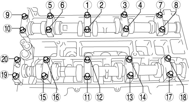 Tighten the camshaft cap bolts in the order shown in the following two steps.