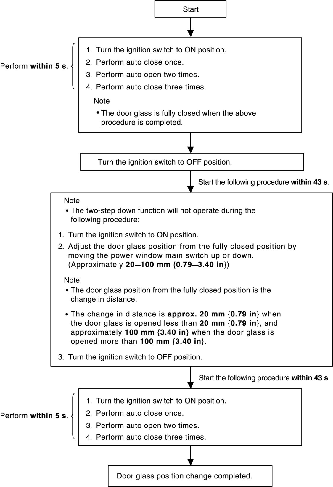 - After performing the following procedure, verify that the two-step down function operates normally and the door glass position has changed. If the two-step down function does not operate or the door glass position has not changed, the procedure was not performed properly. Repeat the procedure from the beginning.