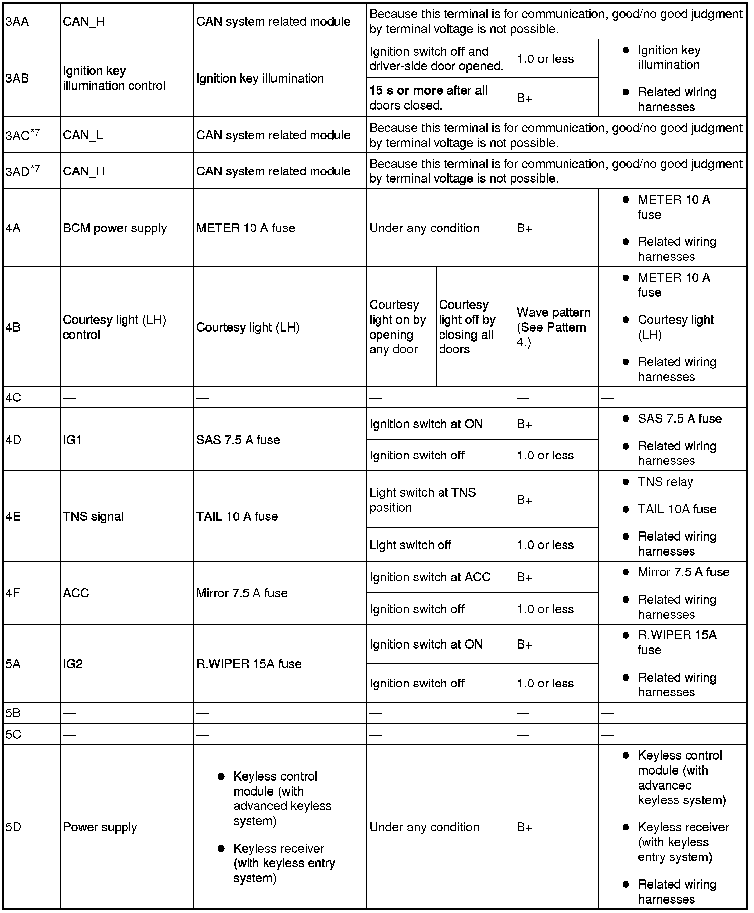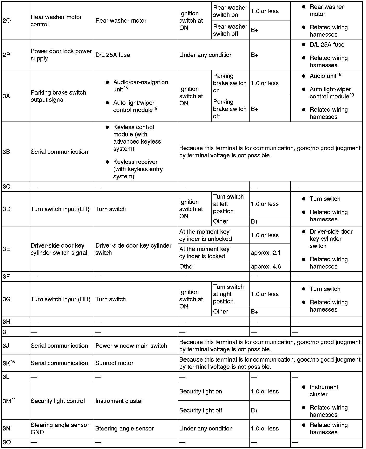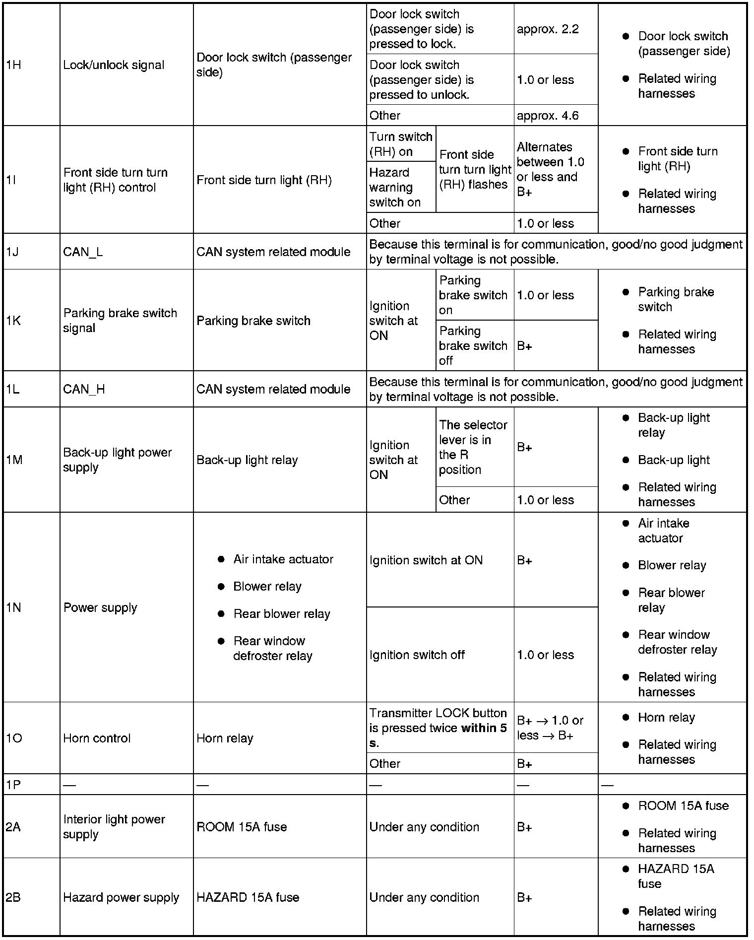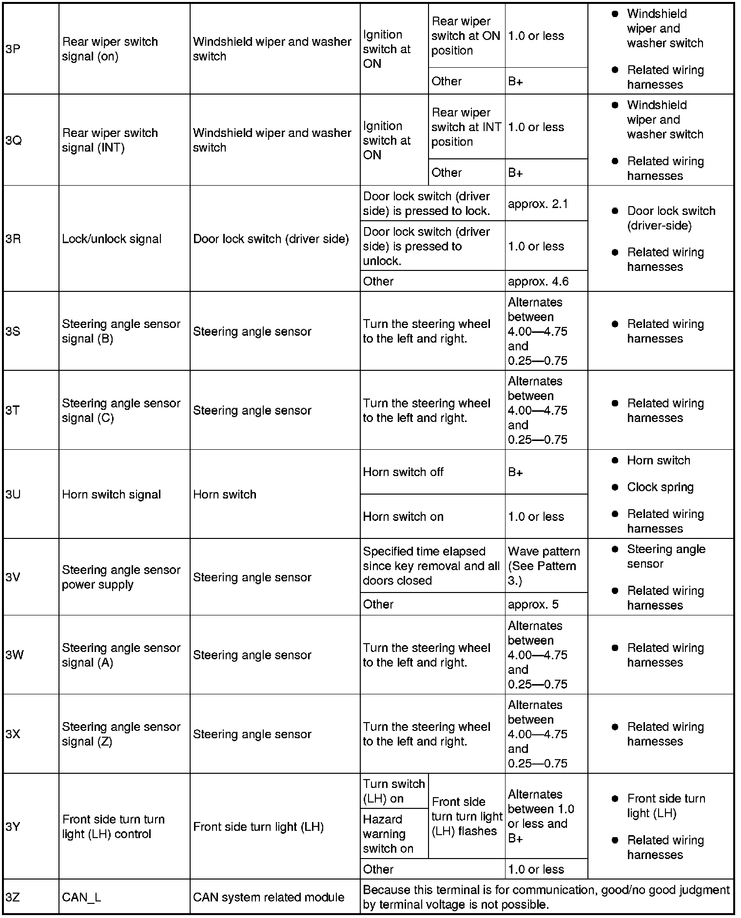 - If the voltage is not as specified in the Terminal Voltage Table, inspect the parts under "Inspection item (s)".