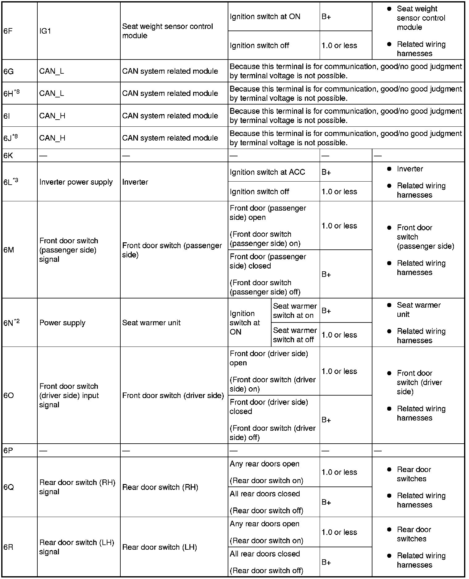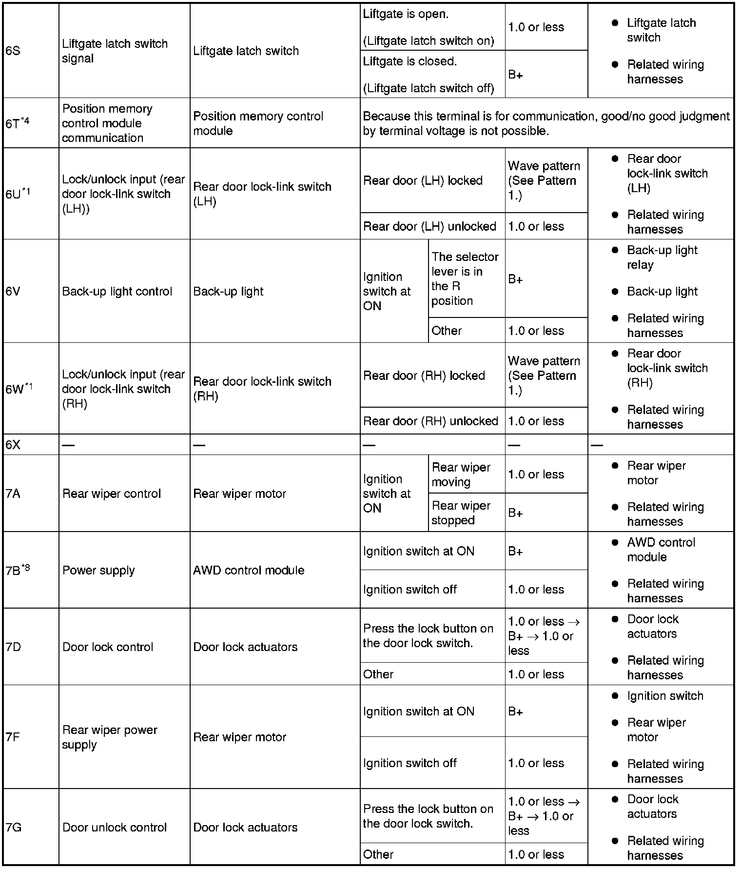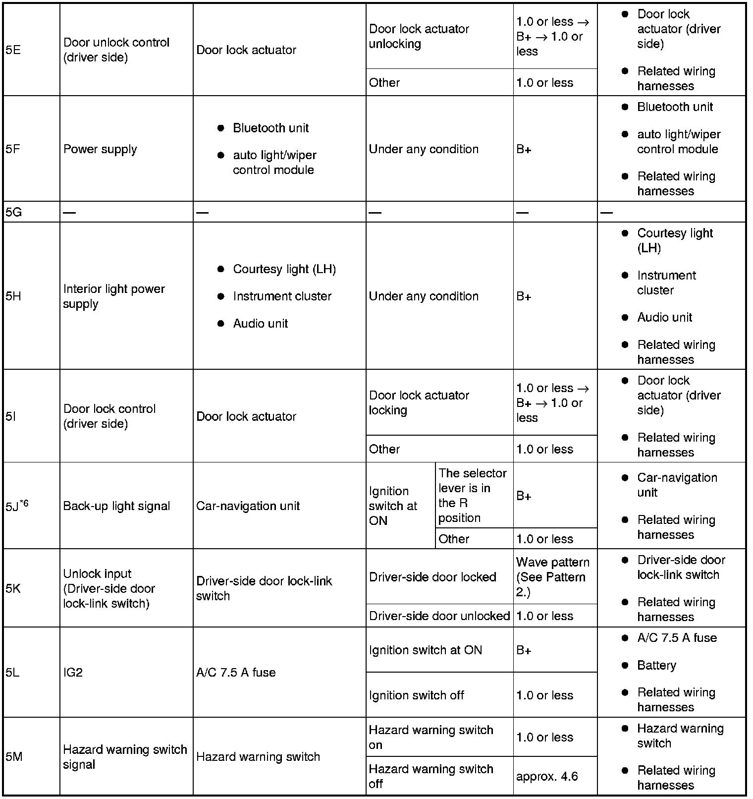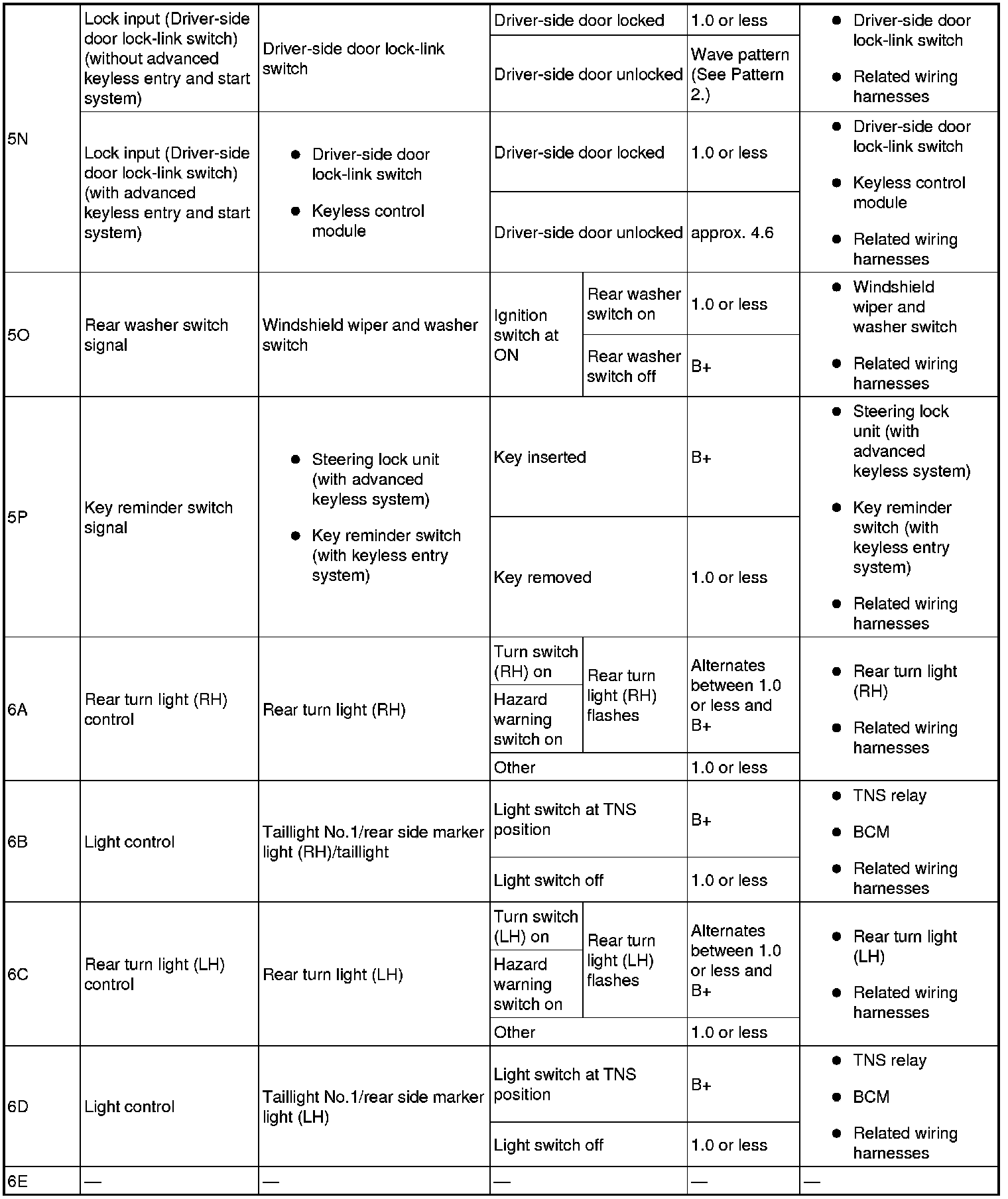 - Lock/unlock input (rear door lock-link switch (RH): 6W (+) -> body ground (-)
