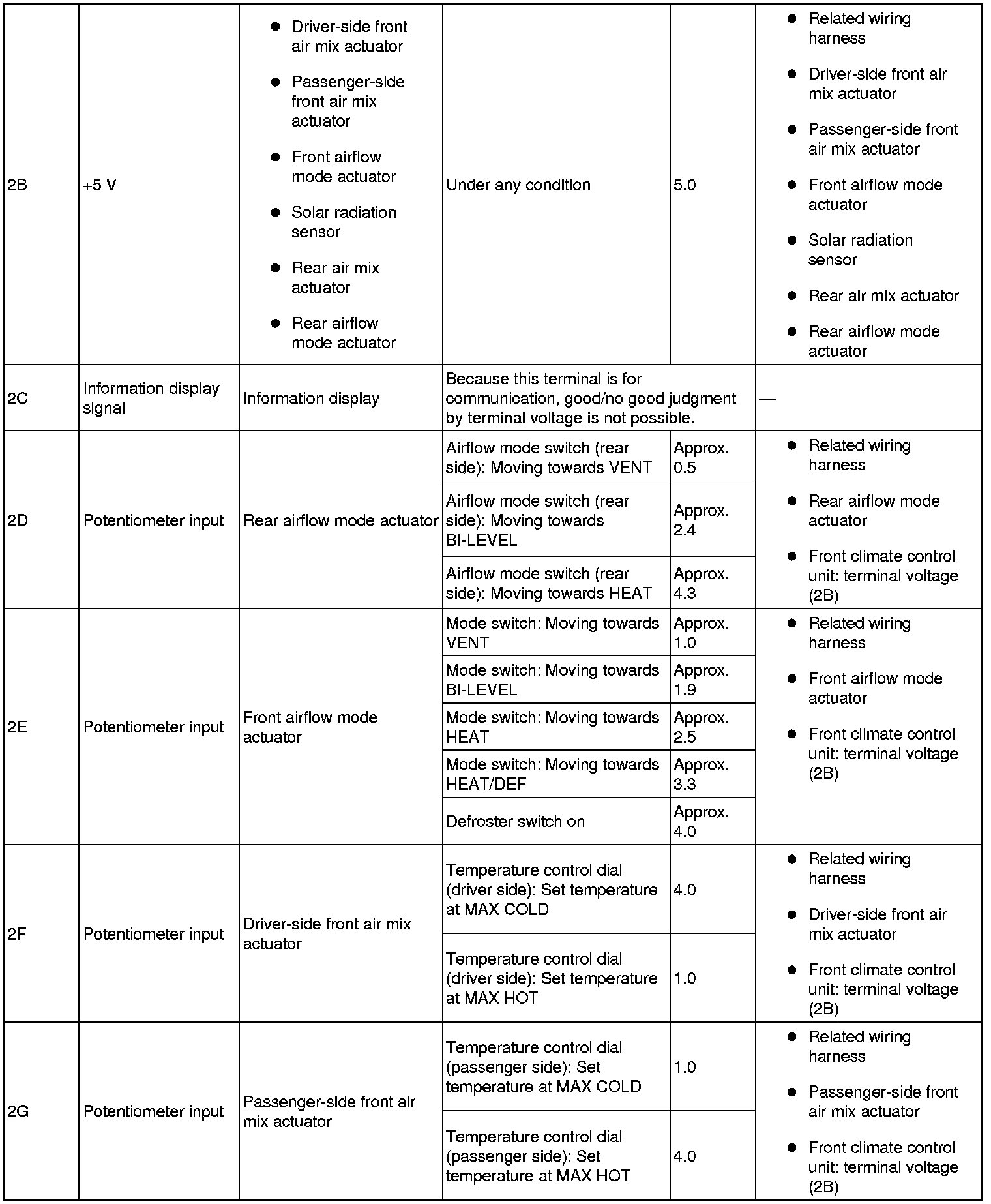 - If the parts under "Inspection item (s)" are found to be normal, replace the front climate control unit.