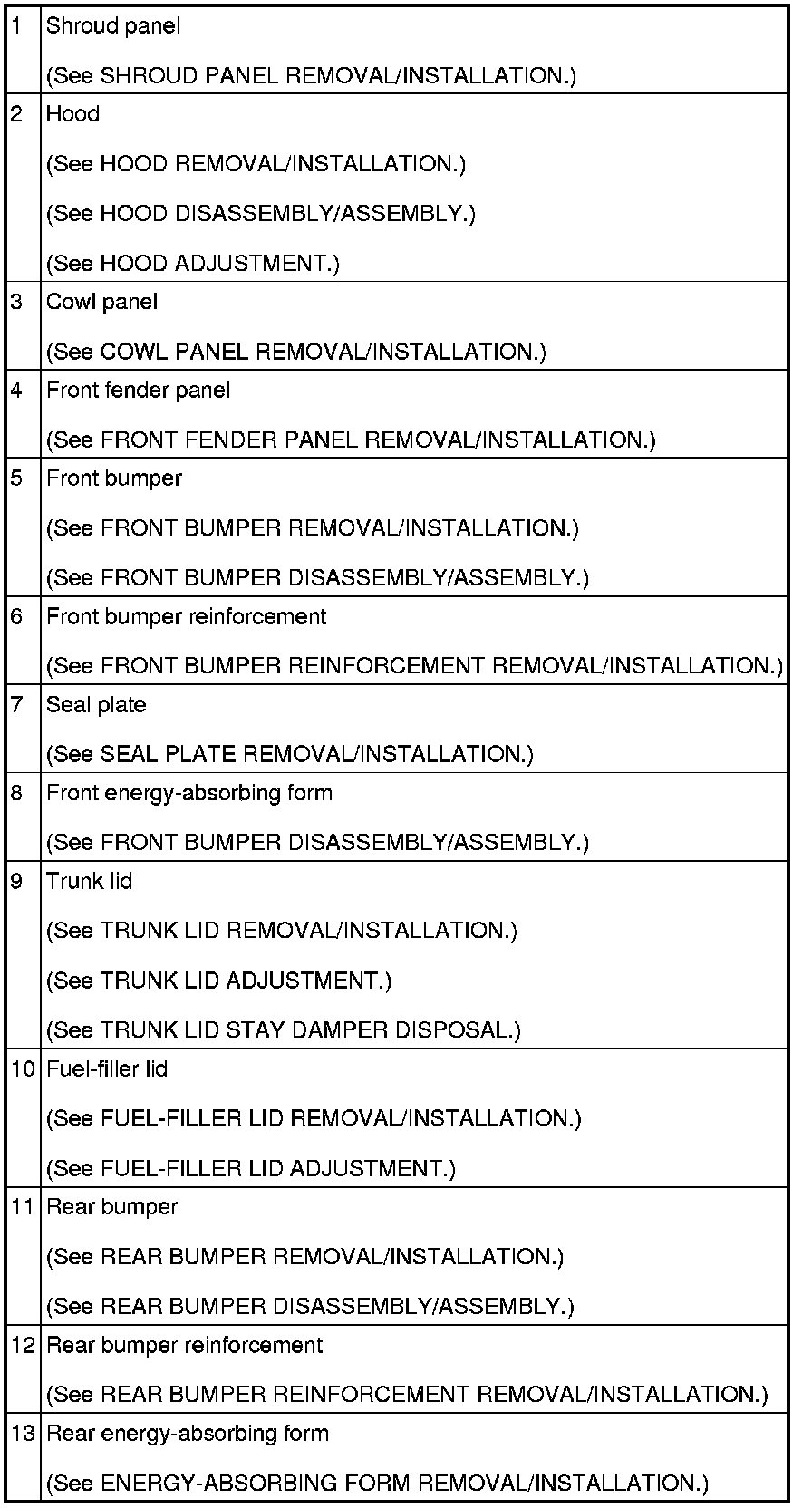 BODY PANELS LOCATION INDEX