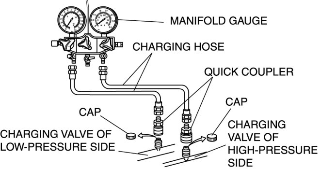 2. Connect the charging hoses to the high- and low-pressure side joints of the manifold gauge.