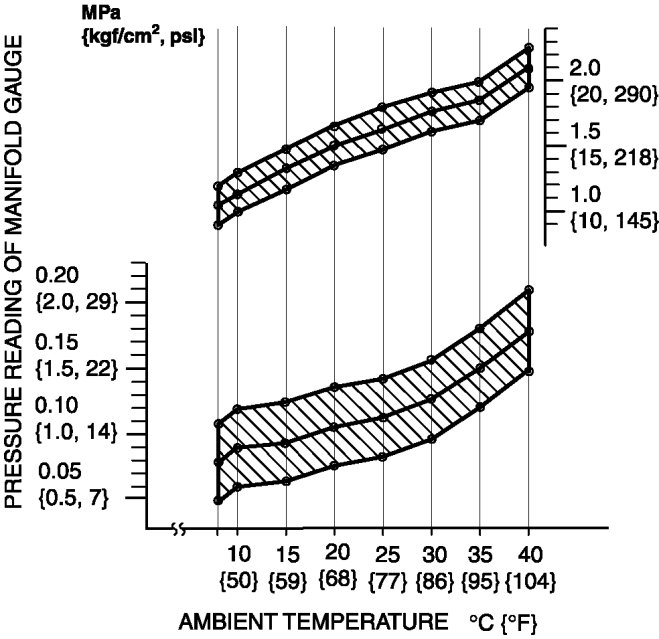 10. Verify that the intersection of the pressure reading of the manifold gauge and ambient temperature is in the shaded zone.
