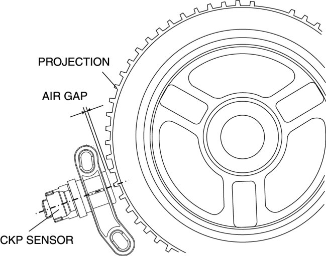 2. Using a thickness gauge, measure the air gap between the plate projections at the back of crankshaft pulley and the CKP sensor.