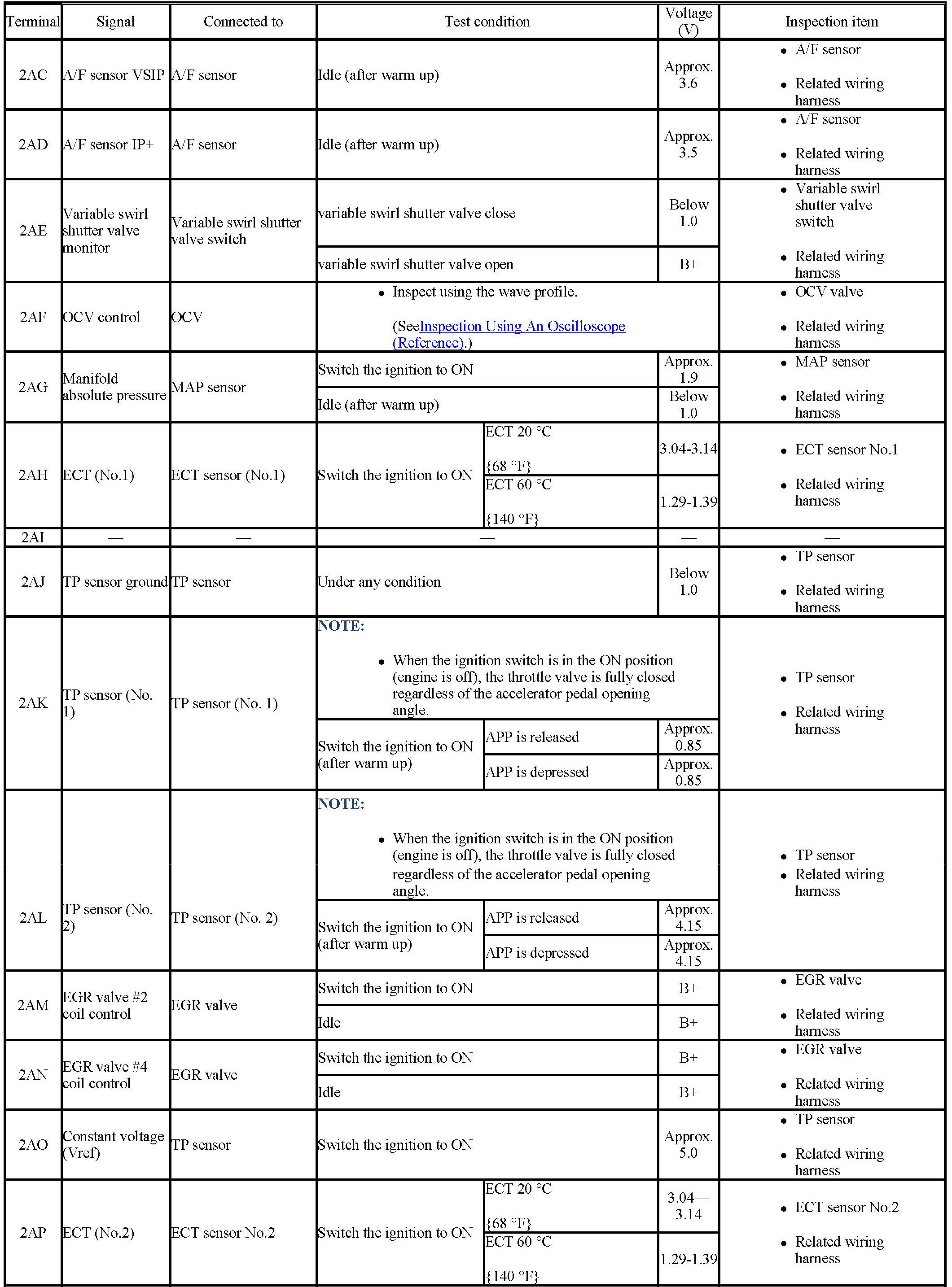- CMP sensor (See CAMSHAFT POSITION (CMP) SENSOR INSPECTION [L3 WITH TC].)