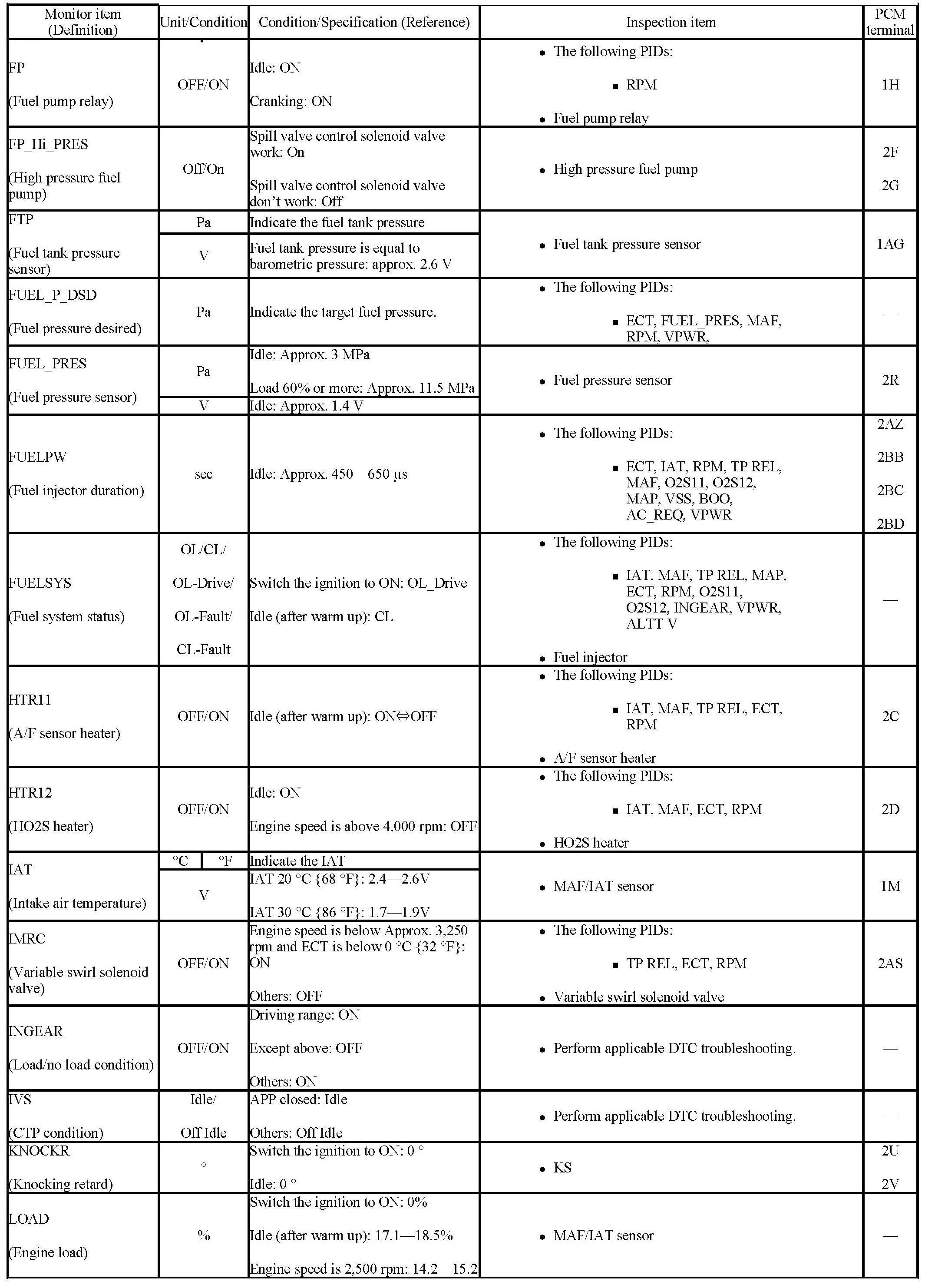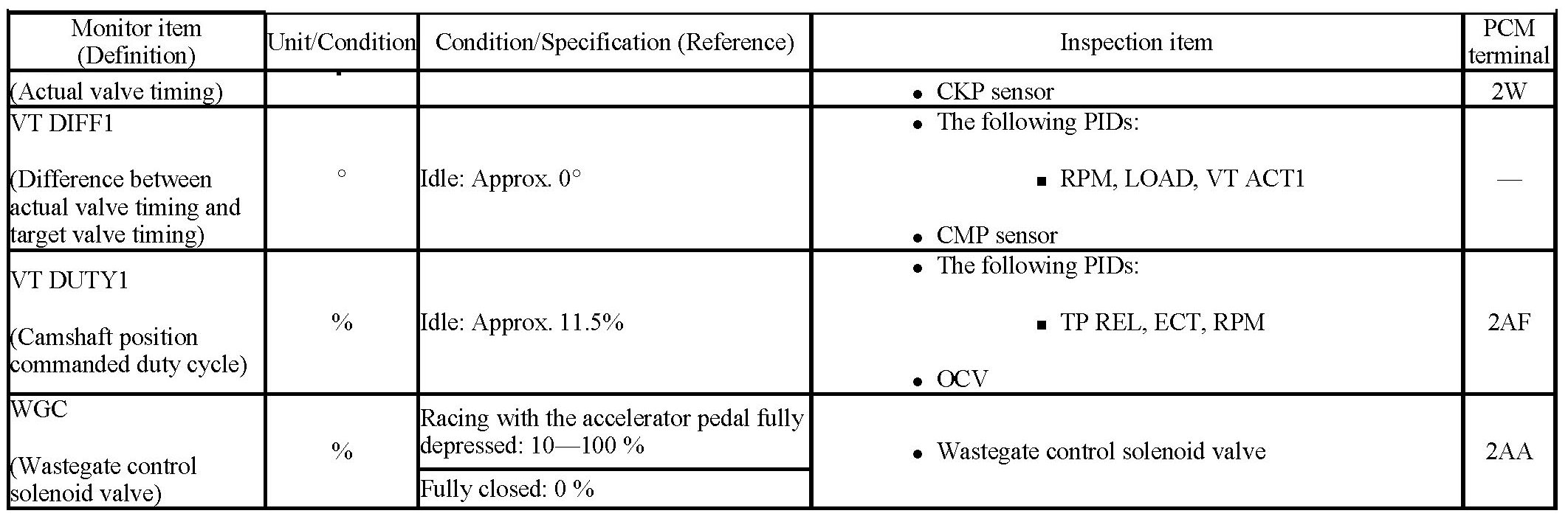 - If PID value is not within the specification, follow the instructions in the "Inspection item" column.