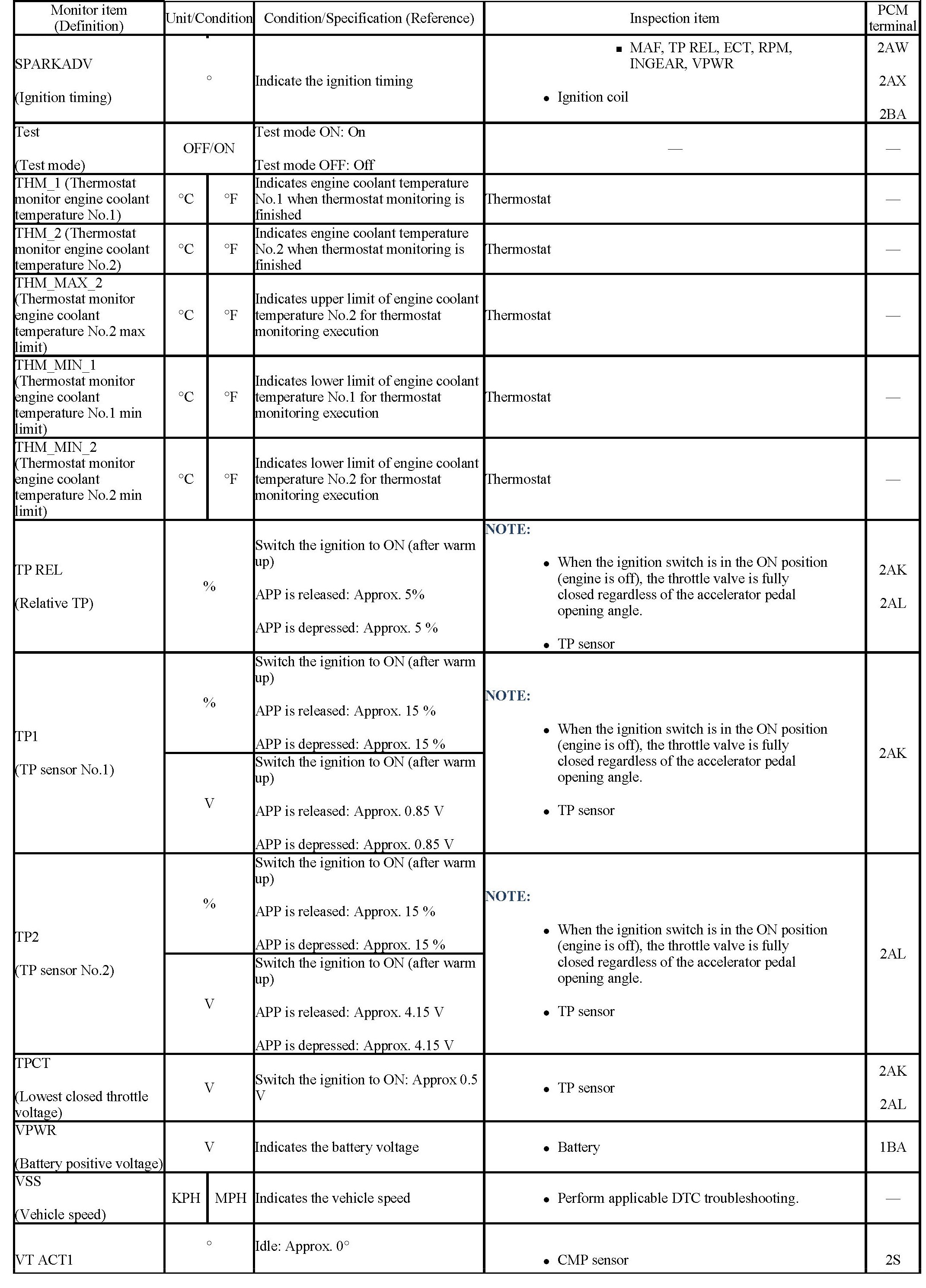 PIDs for the following parts are not available on this model. Perform the specific inspections for the following parts: