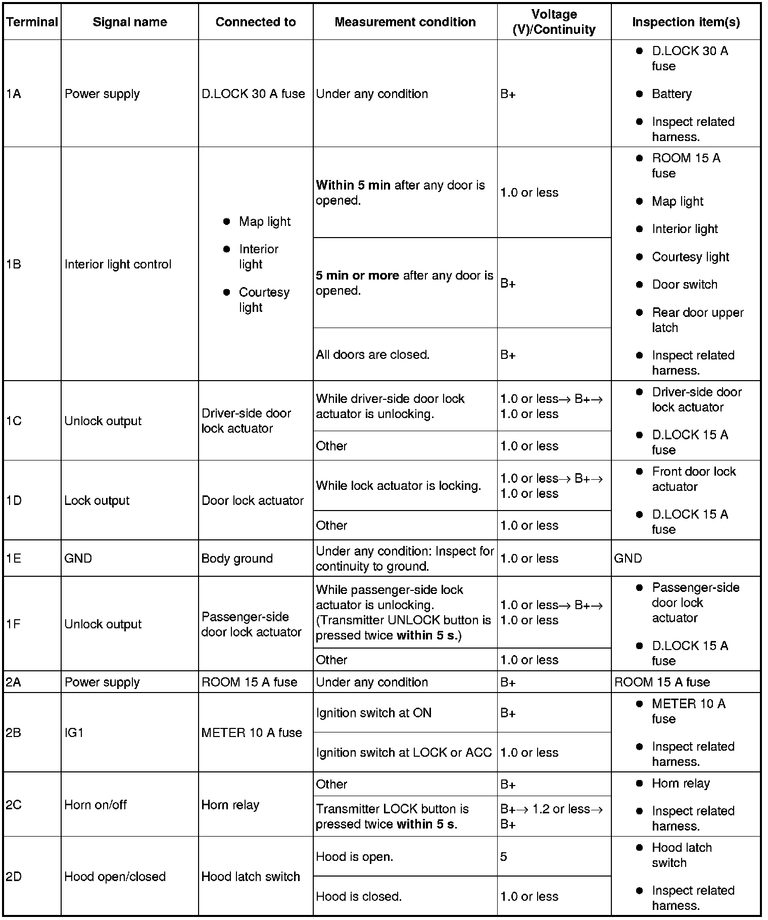 1. Measure the voltage or inspect for continuity according to the Terminal Voltage Table (Reference).