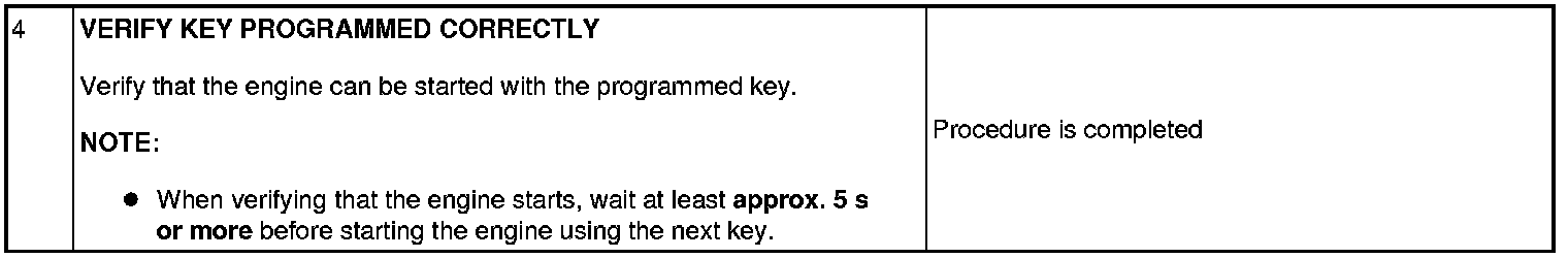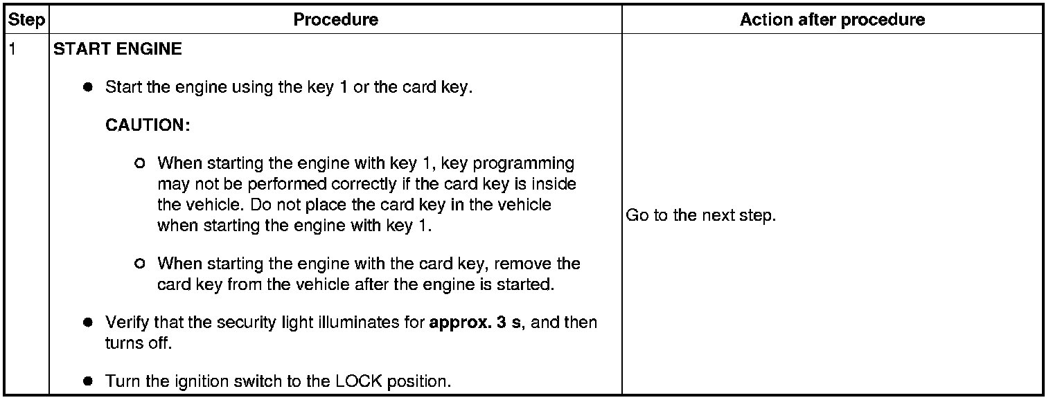 - If the engine is started during immobilizer system-related parts programming, the programming mode cancels. Therefore, do not start the engine unless indicated in the procedure. Repeat the procedure from the beginning if the engine is started during the immobilizer system-related parts programming.