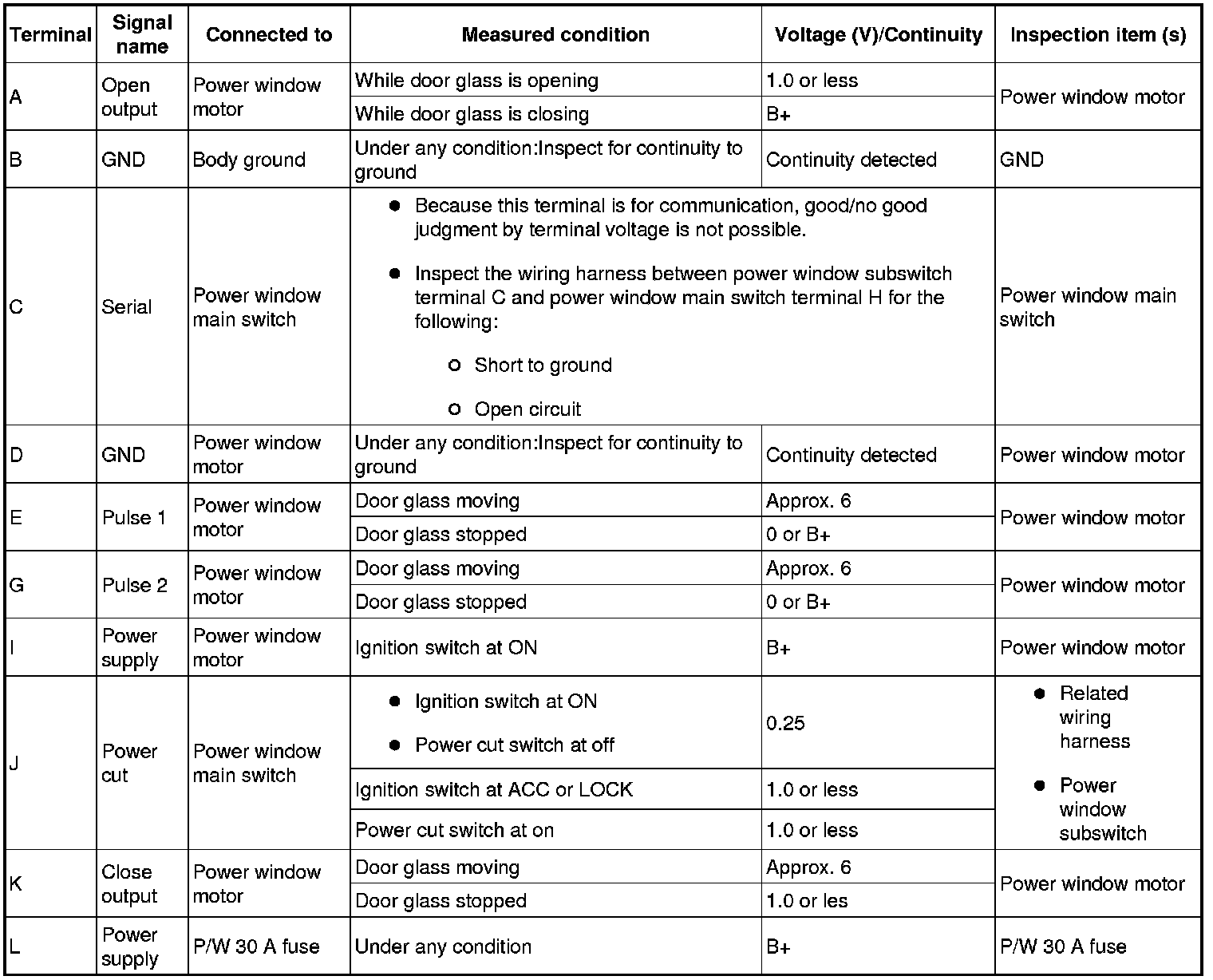 - If the voltage is not as specified in the terminal voltage table, inspect the parts under "Inspection item (s)".