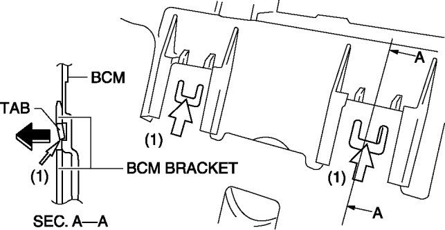 6. Pull the BCM in the direction of the arrow (2) as shown in the figure and remove the BCM bracket.