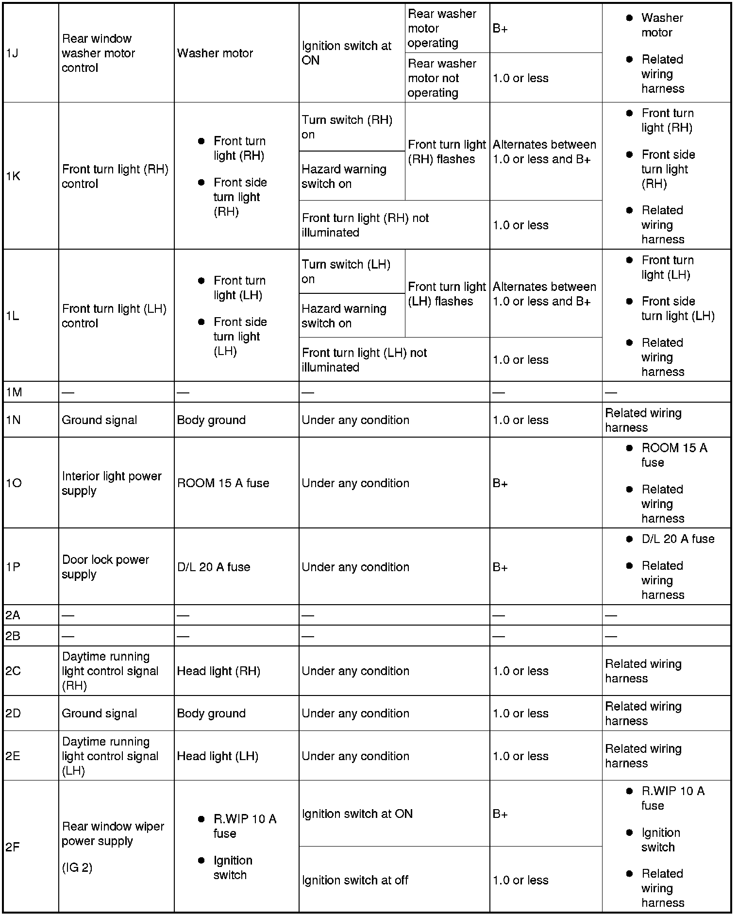 - Turn switch input (RH): 6A (+) -> body ground (-)