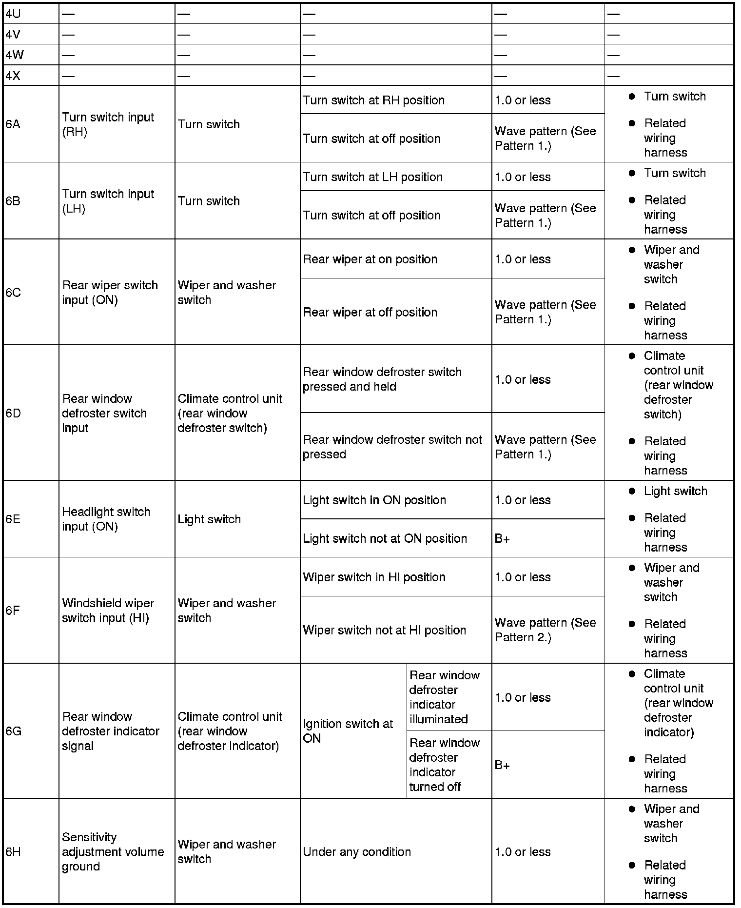 - Rear wiper switch input (ON): 6C (+) -> body ground (-)