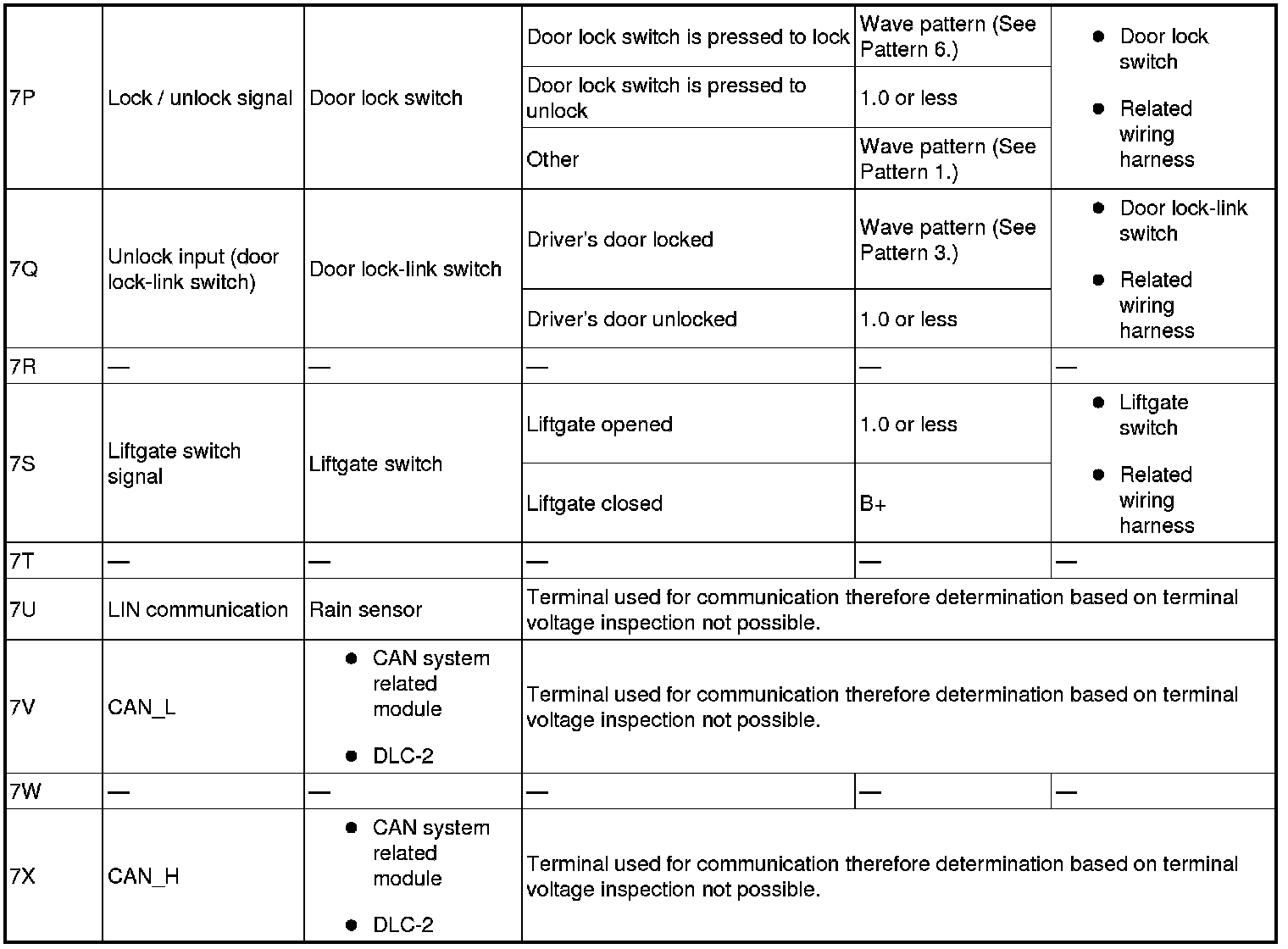 - Lock input (door lock-link switch): 7L (+) -> body ground (-)