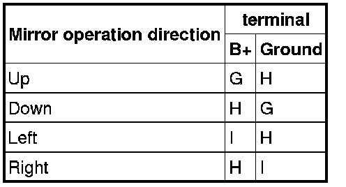 5. Apply battery positive voltage to the power outer mirror terminals and inspect the operation of the power outer mirror.