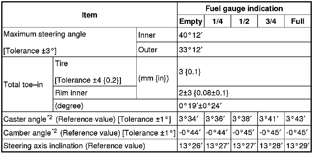 - Toe angle changes by approx. 6 mm {0.2 in} per one rotation of the tie rod for one wheel.
