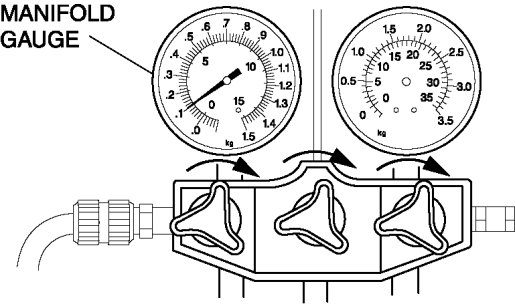 4. When the low-pressure side reading increases to 0.098 MPa {1.0 kgf/cm2, 14 psi}, close the high-pressure side valve of the manifold gauge.