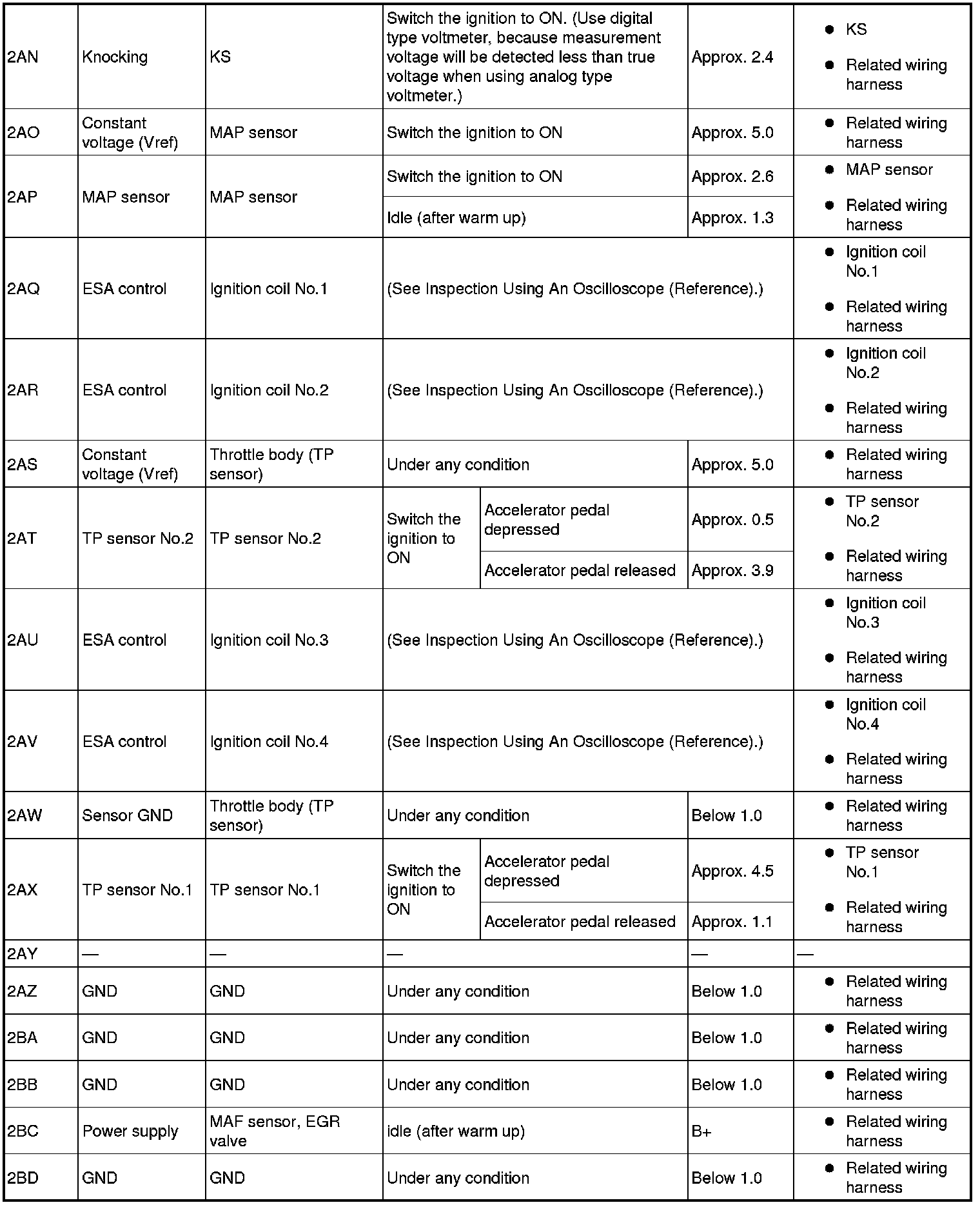 - The PCM terminal voltages vary with change in measuring conditions and vehicle conditions. Always carry out a total inspection of the input systems, output systems, and PCM to determine the cause of trouble. Otherwise, a wrong diagnosis will be made.