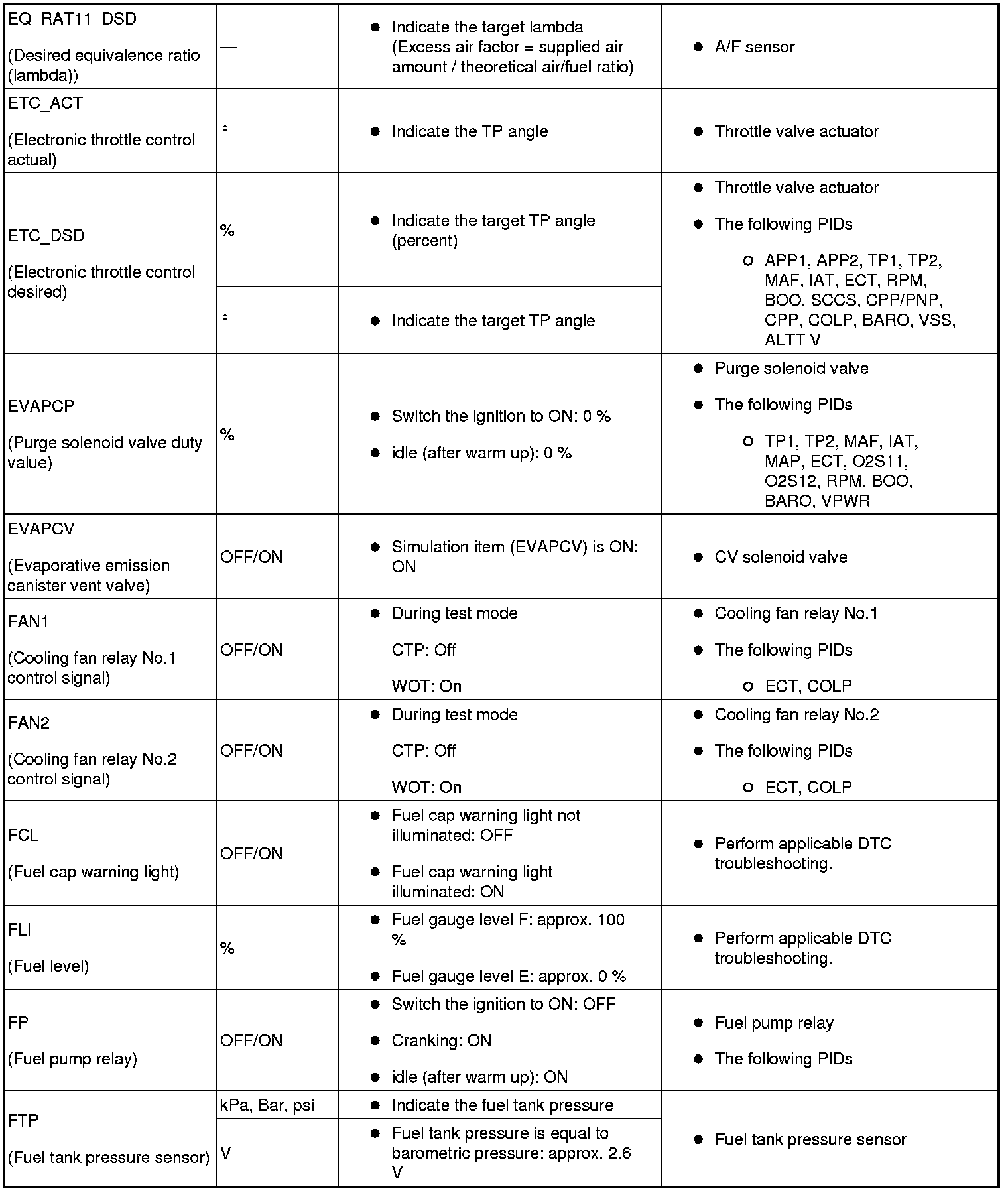- The simulation items that are used in the ENGINE CONTROL SYSTEM OPERATION INSPECTION are as follows.