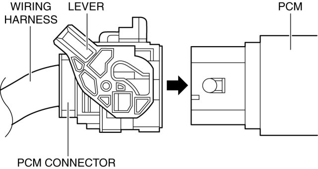 - If the PCM connector is inserted at an angle and the lever is moved, the connector could be damaged. Verify that the PCM connector is inserted straight.