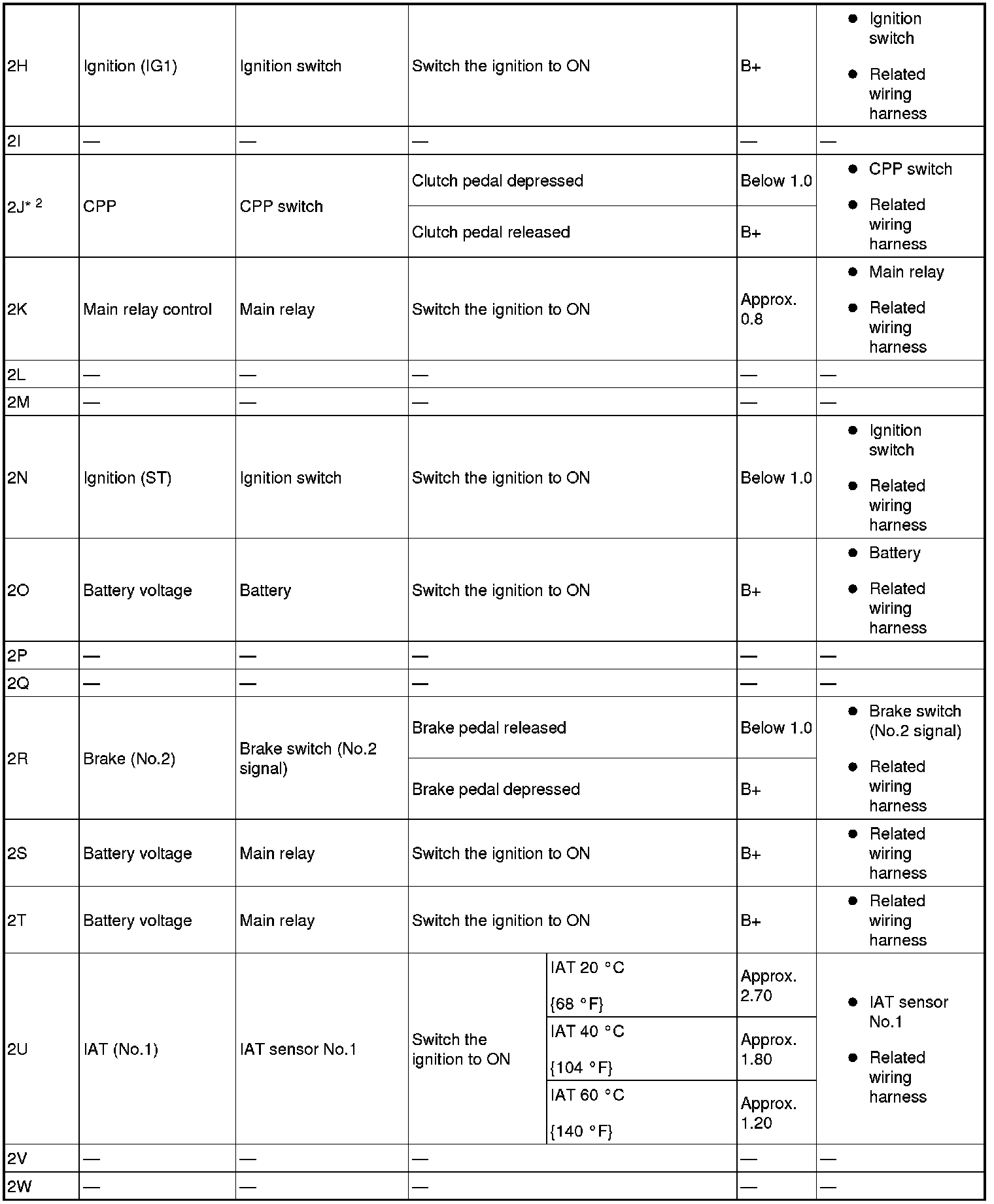 - IGT2(ignition coil No.2): 1AT(+)-body ground(-)
