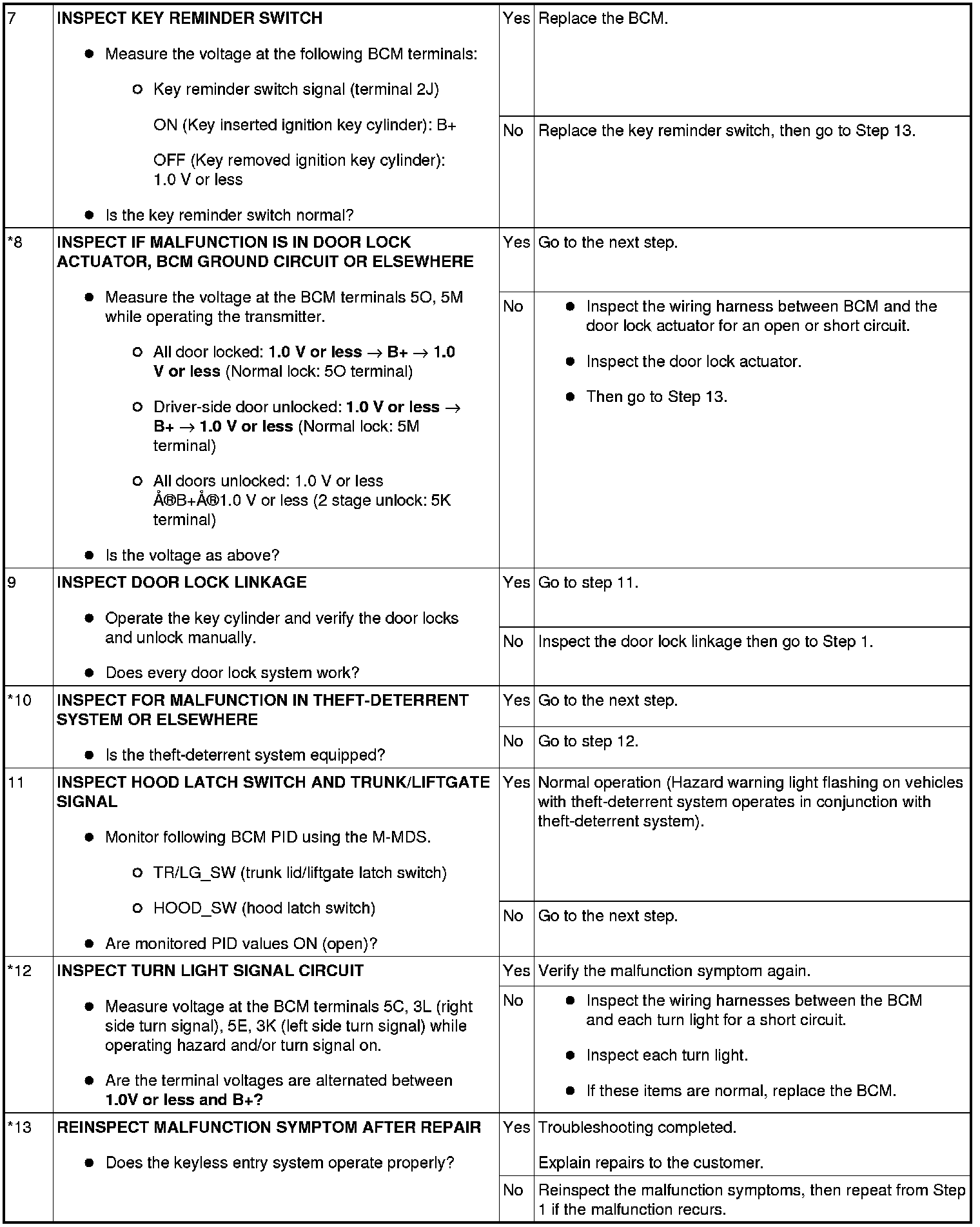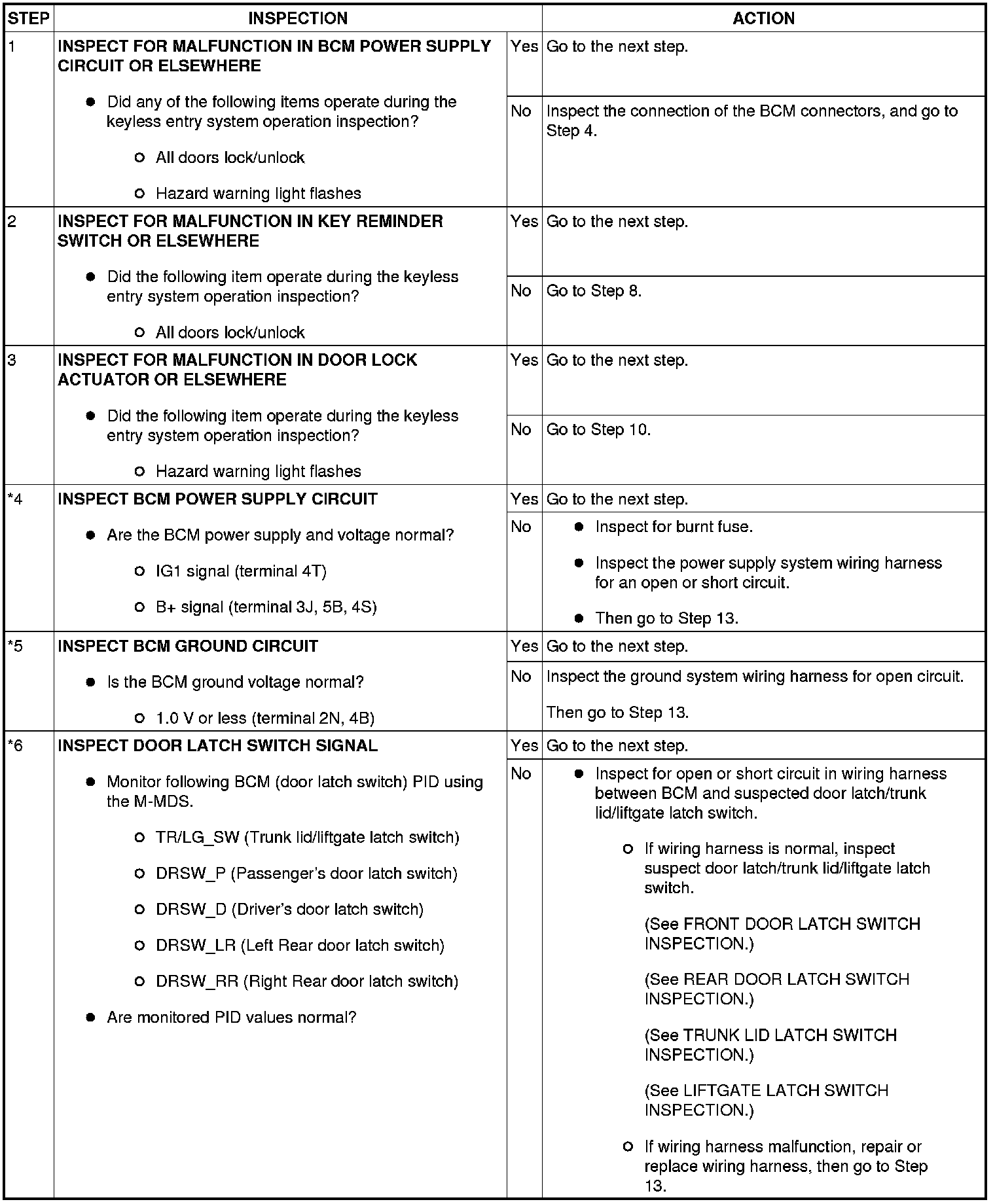 - When performing an asterisked (*) troubleshooting inspection, slightly shake the wiring harness and connectors while performing the inspection to discover whether poor contact points are the cause of any intermittent malfunctions. If there is a problem, verify that the connectors, terminals and wiring harnesses are connected correctly and undamaged.