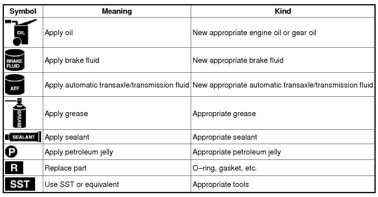 - There are eight symbols indicating oil, grease, fluids, sealant, and the use of SST or equivalent. These symbols show application points or use of these materials during service.