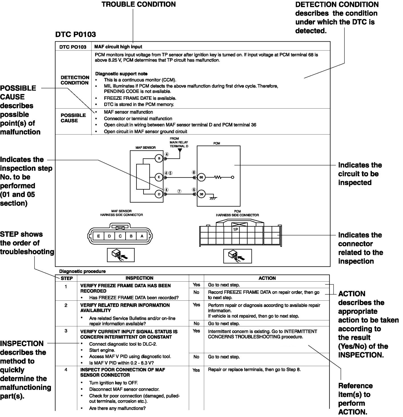 - DTC troubleshooting flow shows diagnostic procedures, inspection methods, and proper action to take for each DTC.