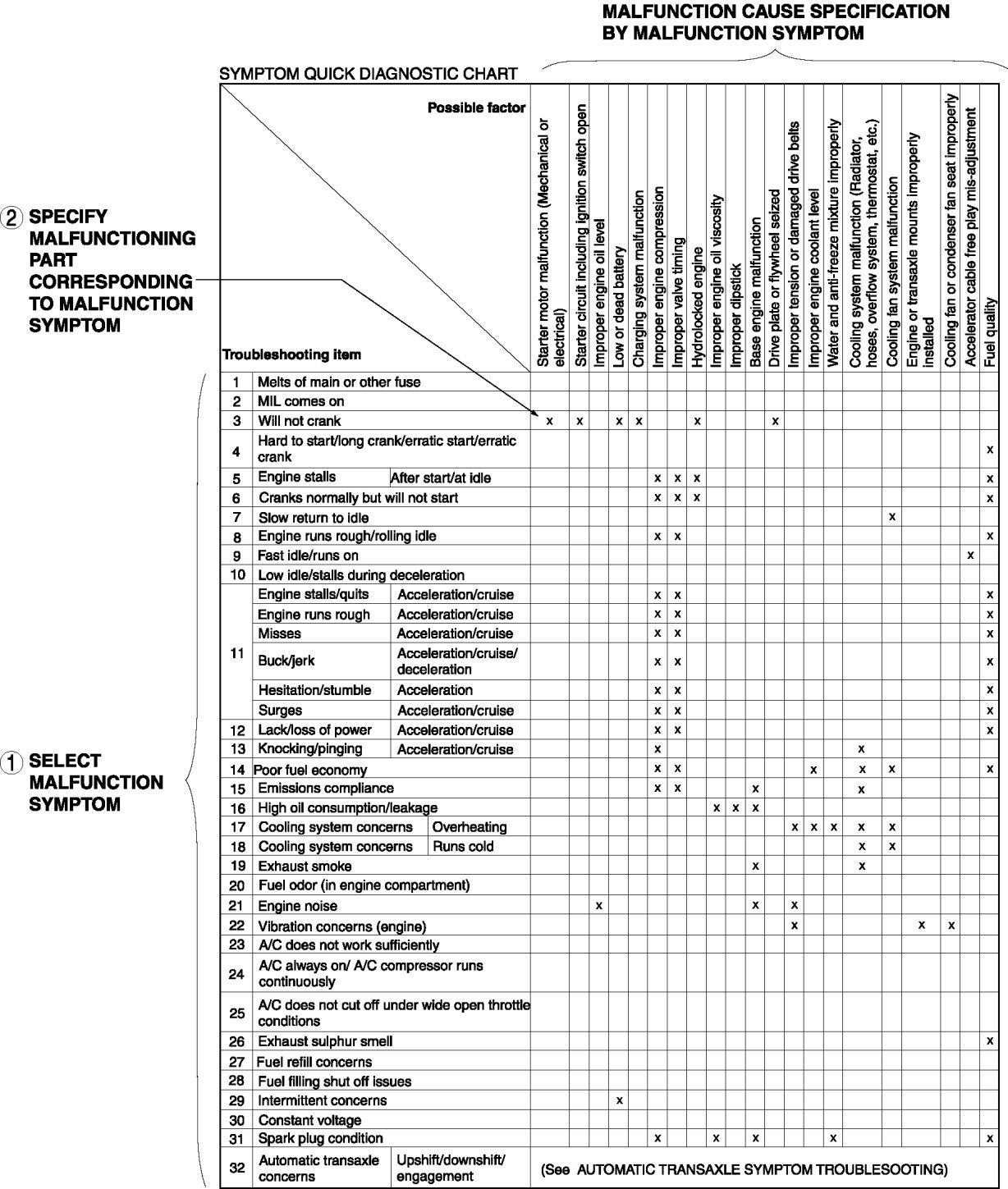 - The chart is effective in quickly narrowing down the relation between symptom and cause of the malfunction. It also specifies a range of common causes when multiple malfunction symptoms occur.