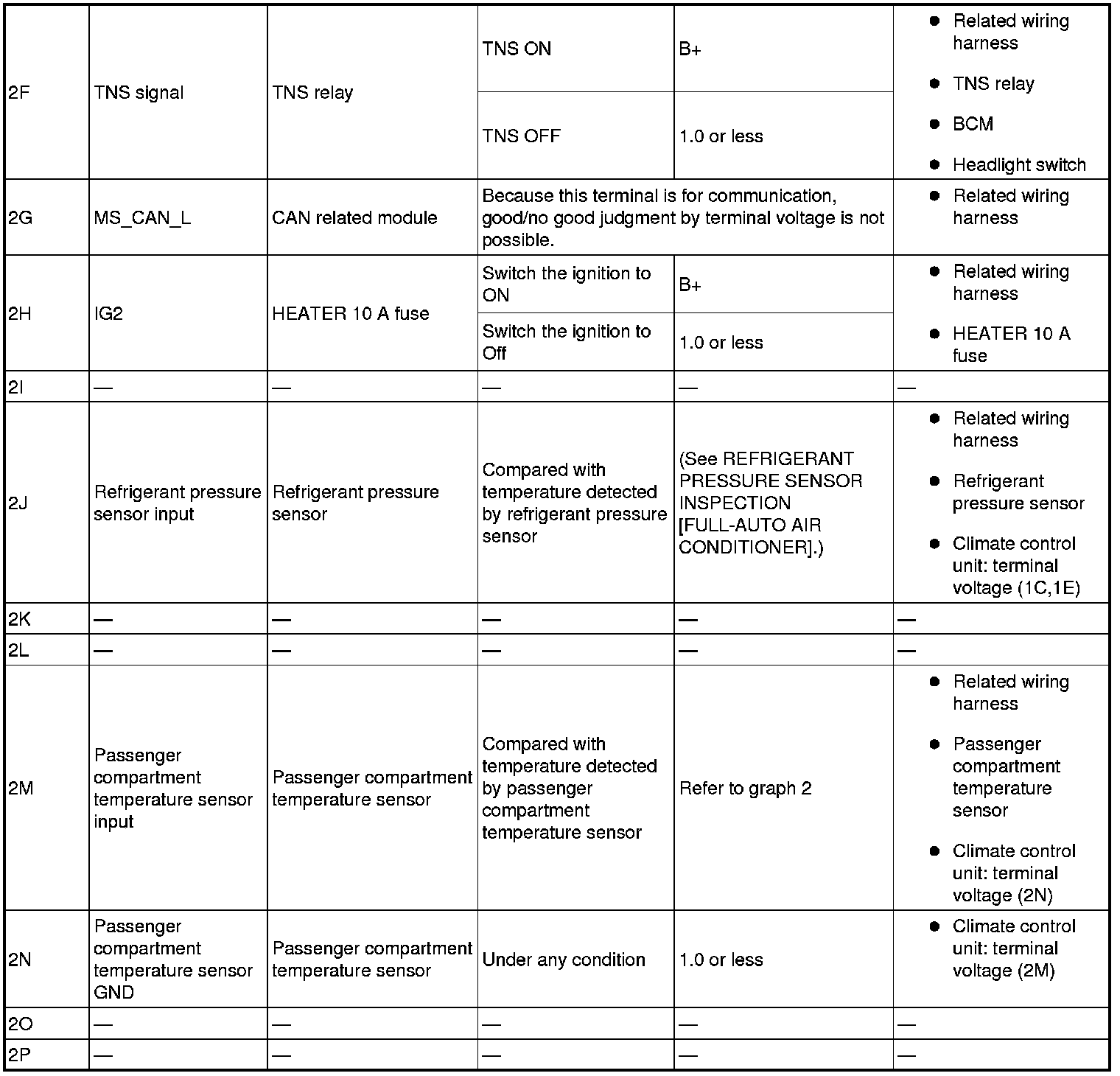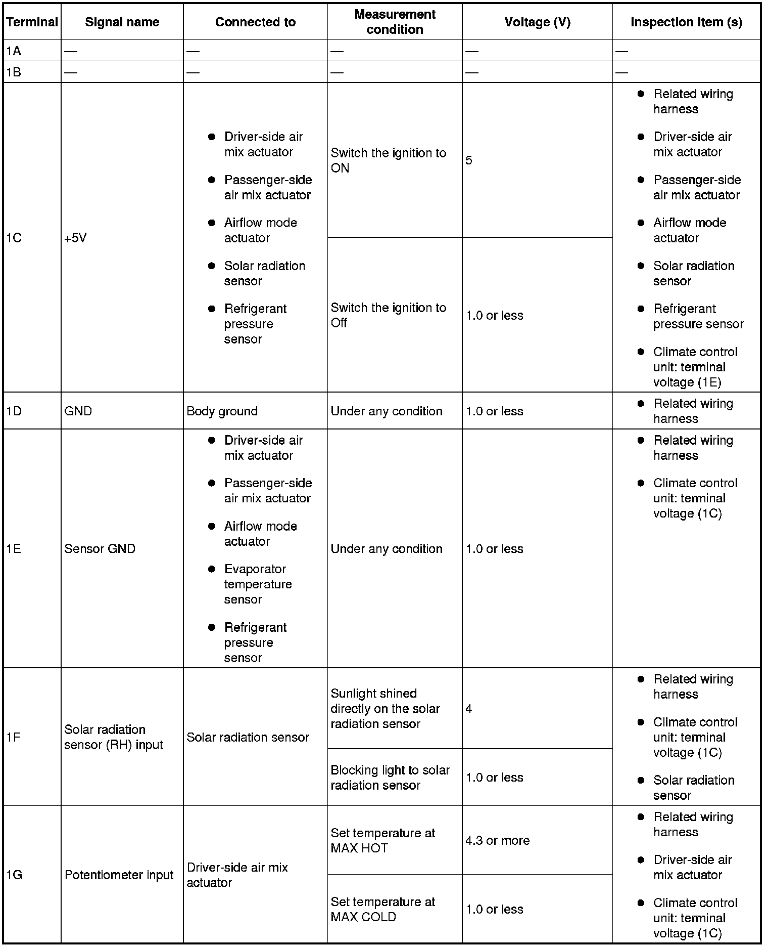 - If the parts under "Inspection item (s)" are found to be normal (except for terminal 1M), replace the climate control unit.