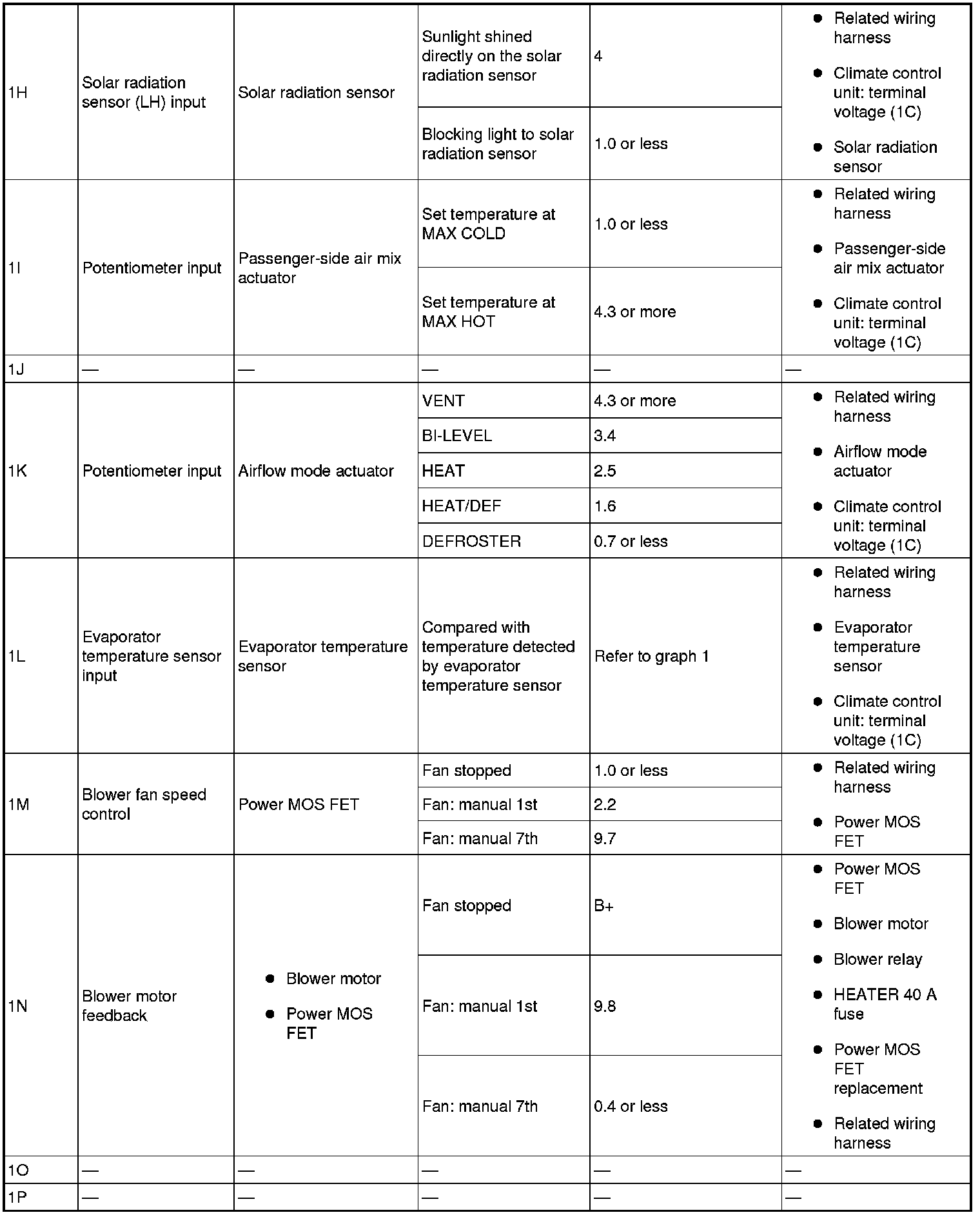 - For terminal 1M, first try replacing the power MOS FET. If there is still any malfunction, replace the climate control unit.