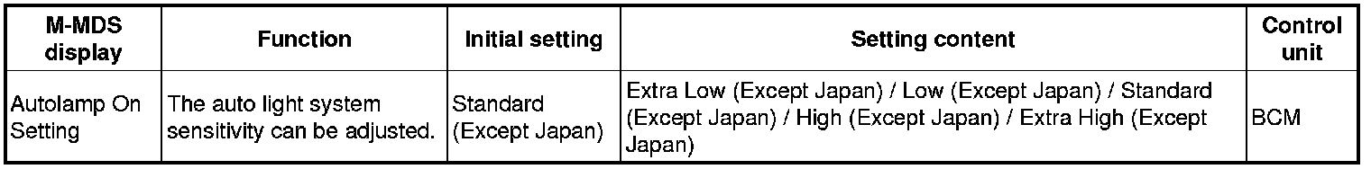 - If the mode is set to "Extra High (Except Japan)" and "High (Except Japan)", the illumination level for illuminating the TNS and headlight increases. Therefore, the TNS and headlights illuminate when the ambient light is brighter than when the level is set to "Standard (Except Japan)". In addition, if the mode is set to "Low (Except Japan)" and "Extra Low (Except Japan)", the illumination level for illuminating the TNS and headlights decreases. Therefore, the TNS and headlights illuminate when the ambient light is lower than when the level is set to "Standard (Except Japan)".