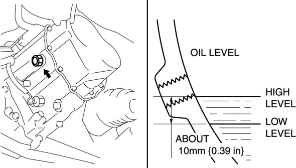 - If the oil level is lower than the low level, add the specified amount and type of oil through the oil level plug hole.
