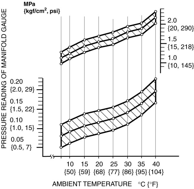 10. Verify that the intersection of the pressure reading of the manifold gauge and ambient temperature is in the shaded zone.