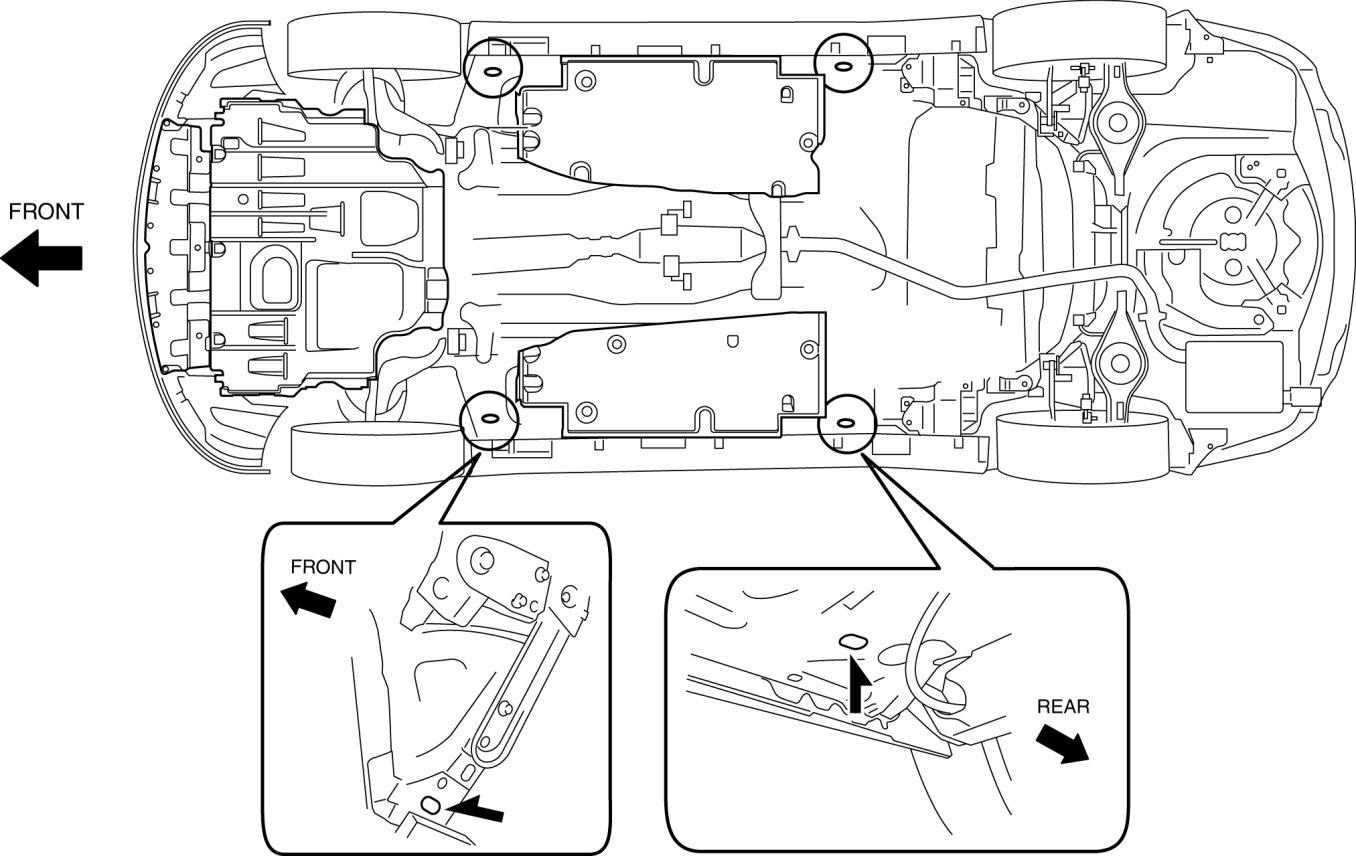 - When transporting the vehicle by flat bed tow truck or trailer, secure the vehicle to the trailer using the holes and left tiedown loop shown in the figure.