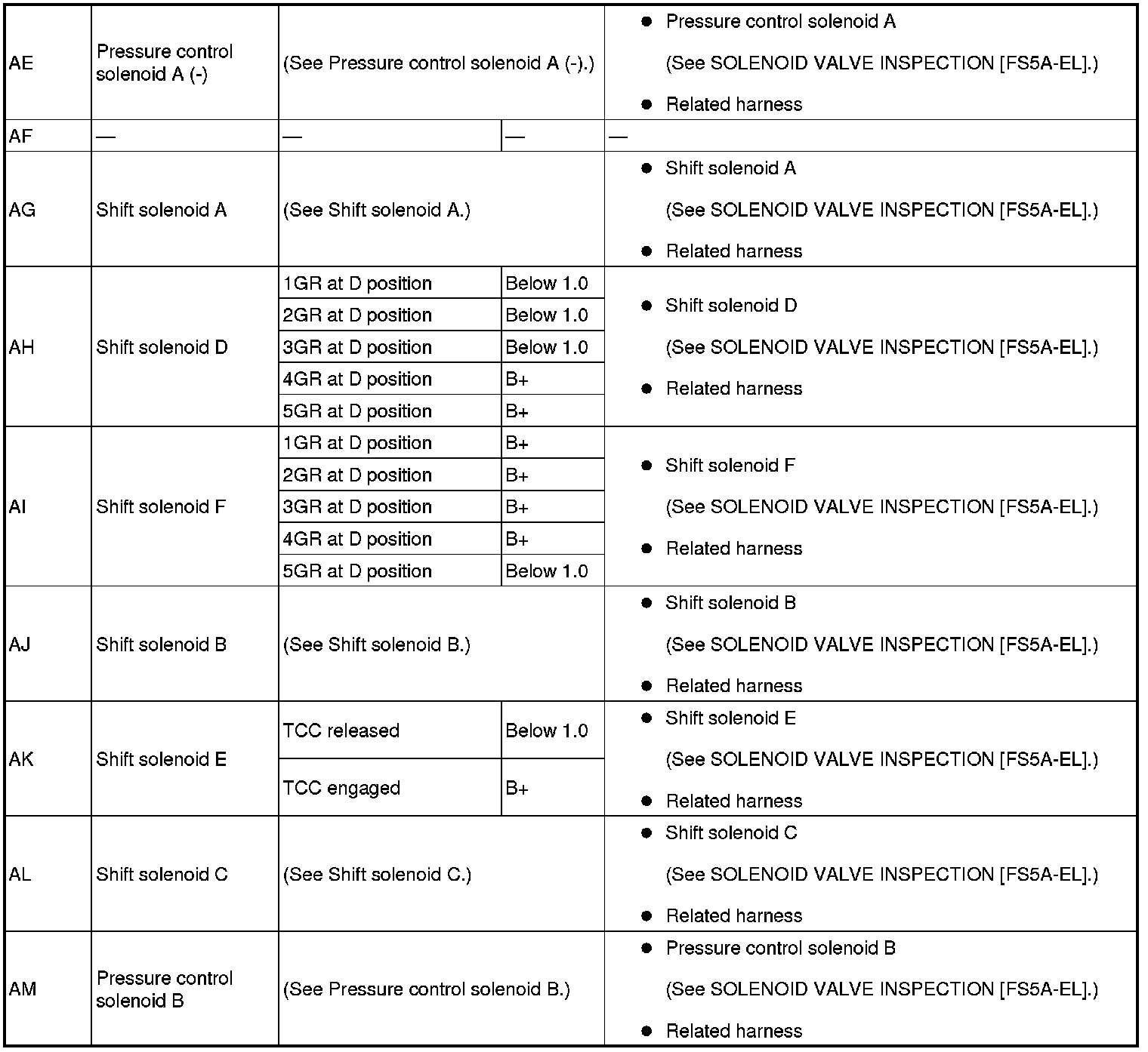 - If any incorrect voltage is detected, inspect the related system(s), wiring harnesses and connector(s) referring to the "Inspection Item" column in the "TCM Terminal Voltage".