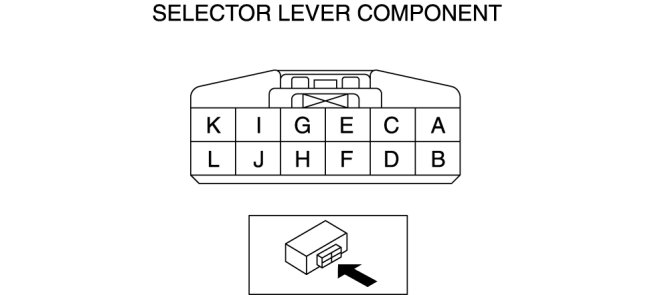 2. Inspect the continuity between the selector lever component terminals G and K.
