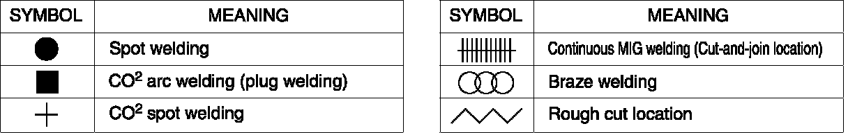The following 6 symbols are used to indicate the type of weld that is used when replacing body panels.