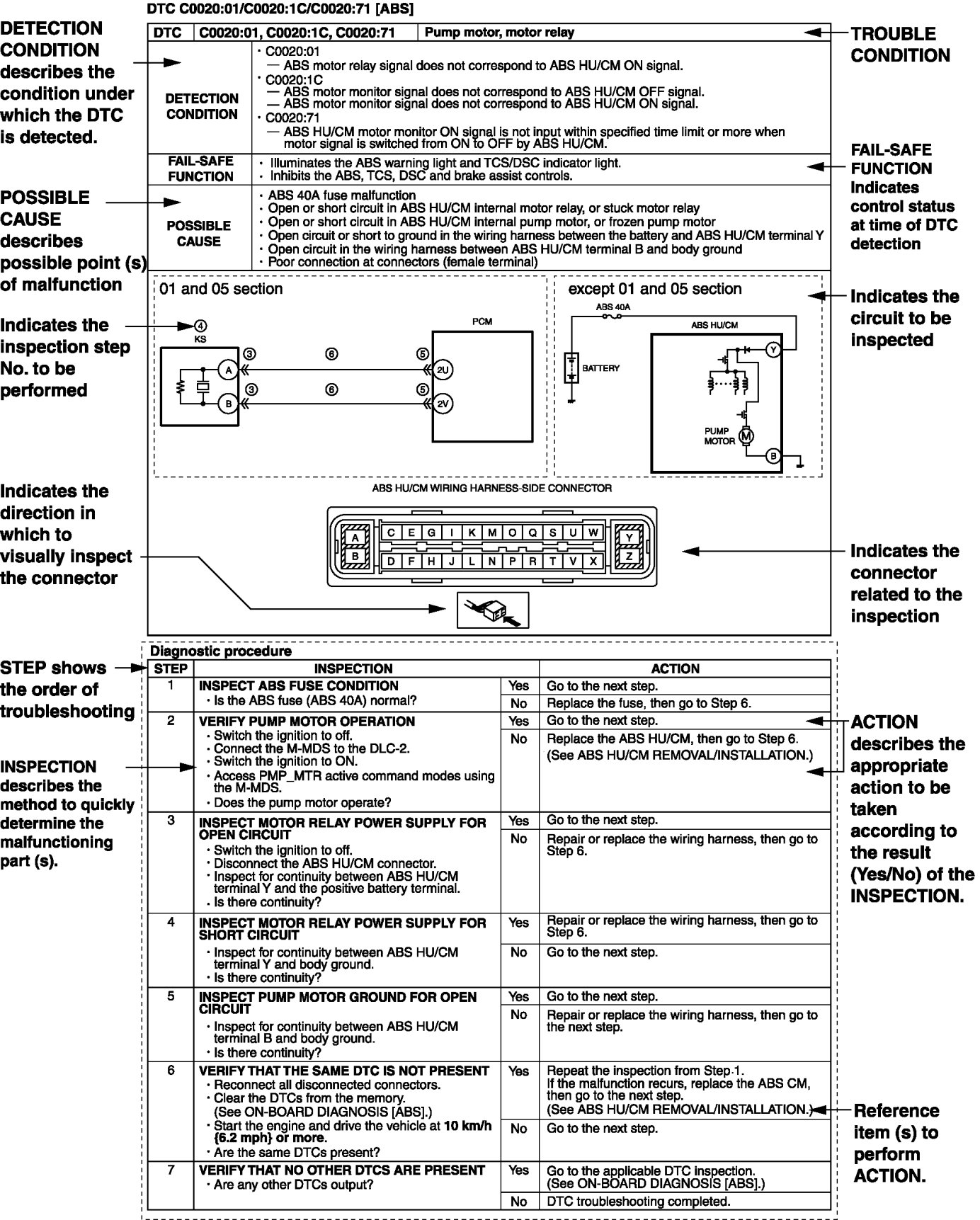 - DTC troubleshooting flow shows diagnostic procedures, inspection methods, and proper action to take for each DTC.