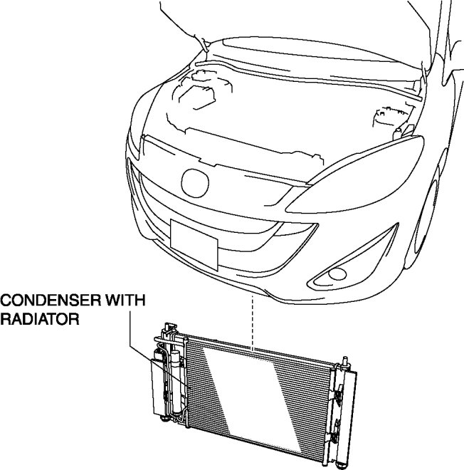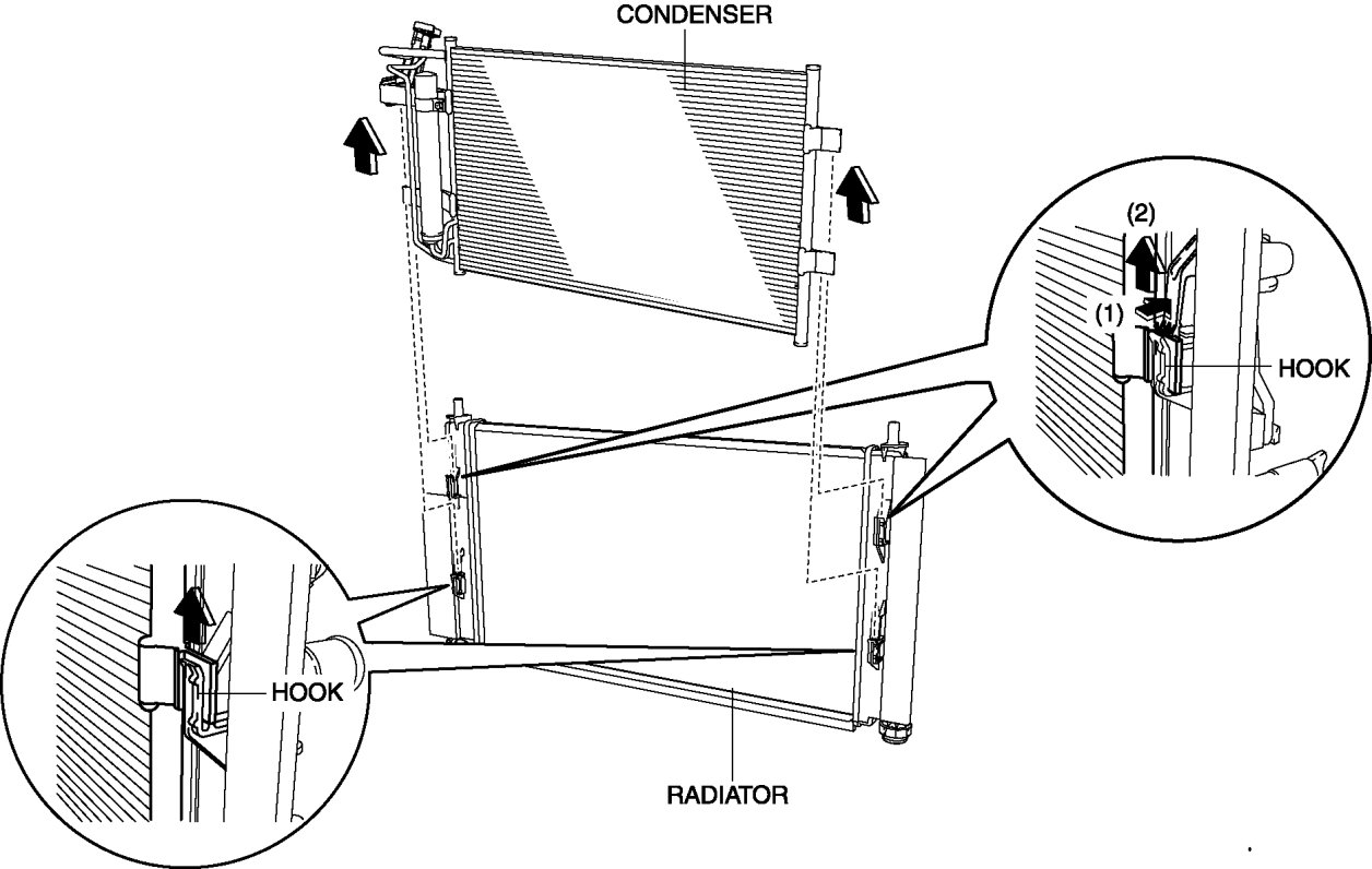 10. Release the radiator hook and pull the condenser up, being careful not to allow remaining compressor oil in the condenser to spill.