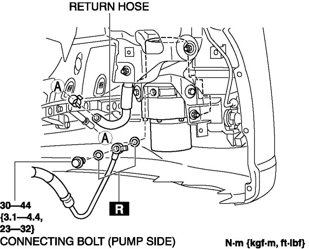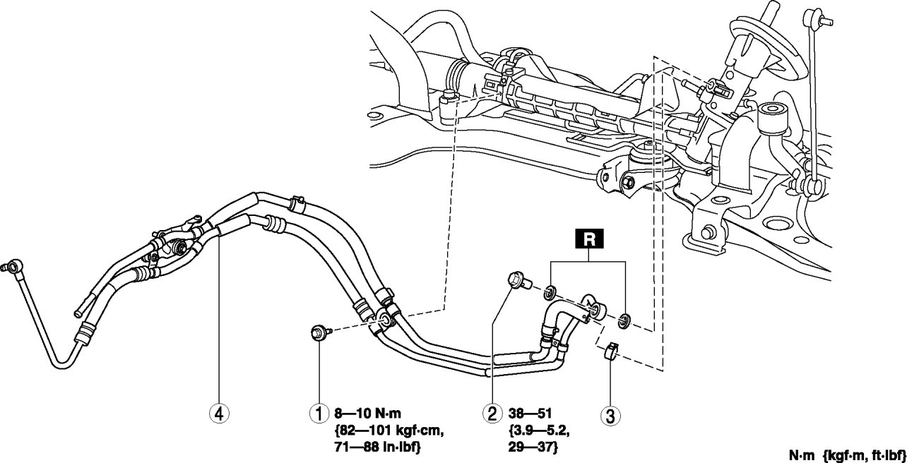 - The following procedure is for replacement of the parts shown in the figure. Regarding replacement of the suction hose and return hose, refer to the electric power steering oil pump component removal/installation. Removal and Replacement