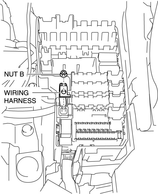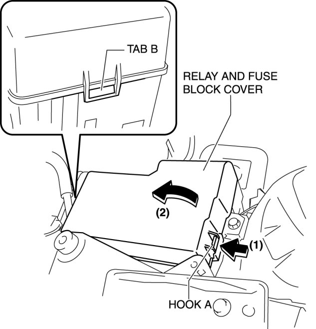 - Detaching tab B without detaching hook A could damage the relay and fuse block cover. When removing the relay and fuse block cover, always detach hook A first.