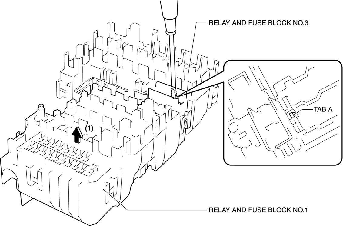 1. Remove relay and fuse block No. 1 from relay and fuse block No.3 in the direction of the arrow (1) shown in the figure with tab A of relay and fuse block No.1 released.