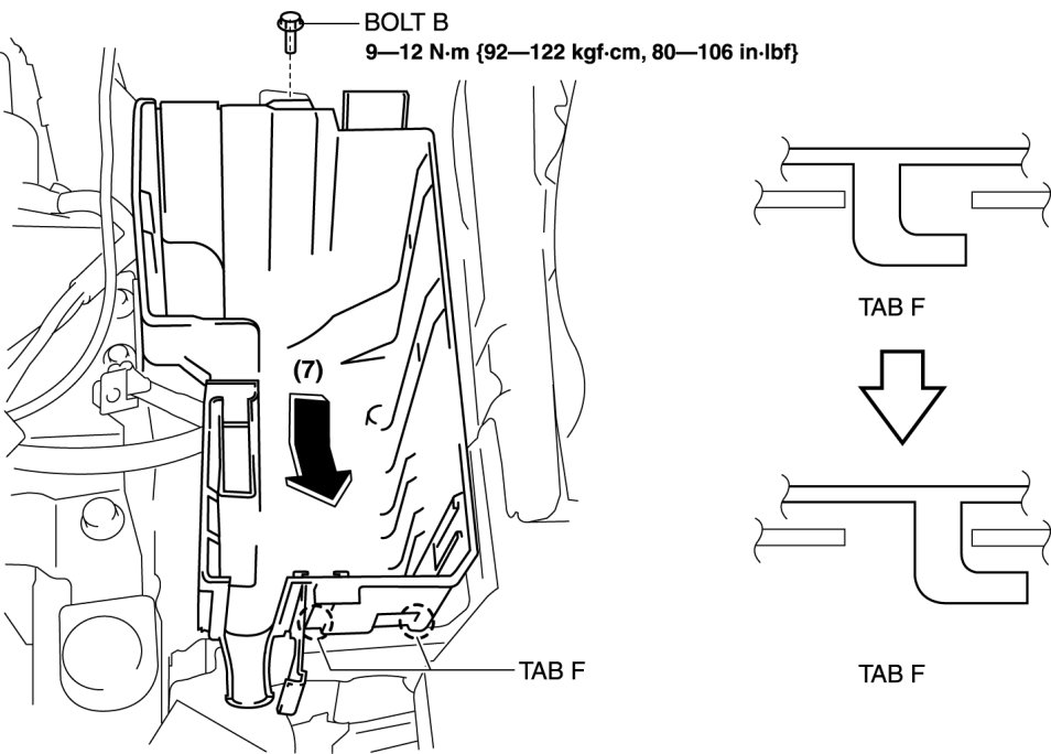 10. Insert tab F into the wheel apron panel (front) and install the relay and fuse block lower cover in the direction of the arrow (7) shown in the figure.