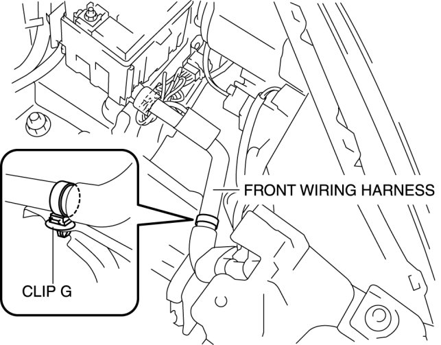 18. Install front wiring harness securing clip G.