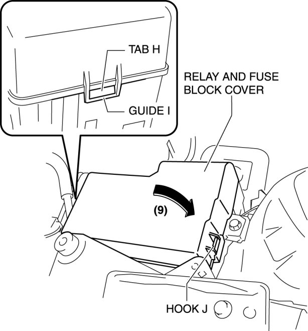 20. Tilt the relay and fuse block cover in the direction of the arrow (9) shown in the figure while hooking guide I to tab H to engage with hook J.