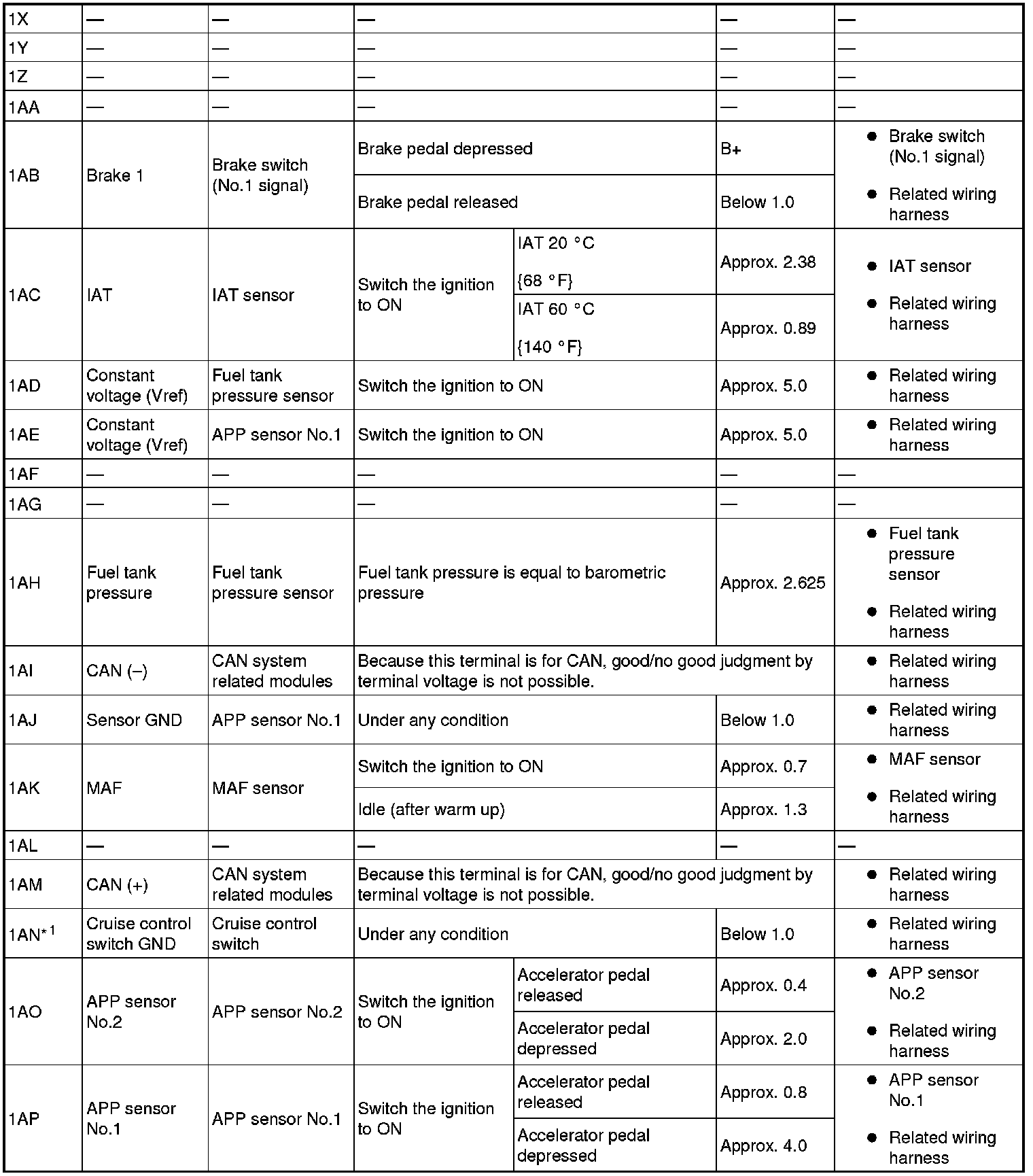 - If any incorrect voltage is detected, inspect the related system(s), wiring harnesses and connector(s) referring to the Action column in the terminal voltage table.