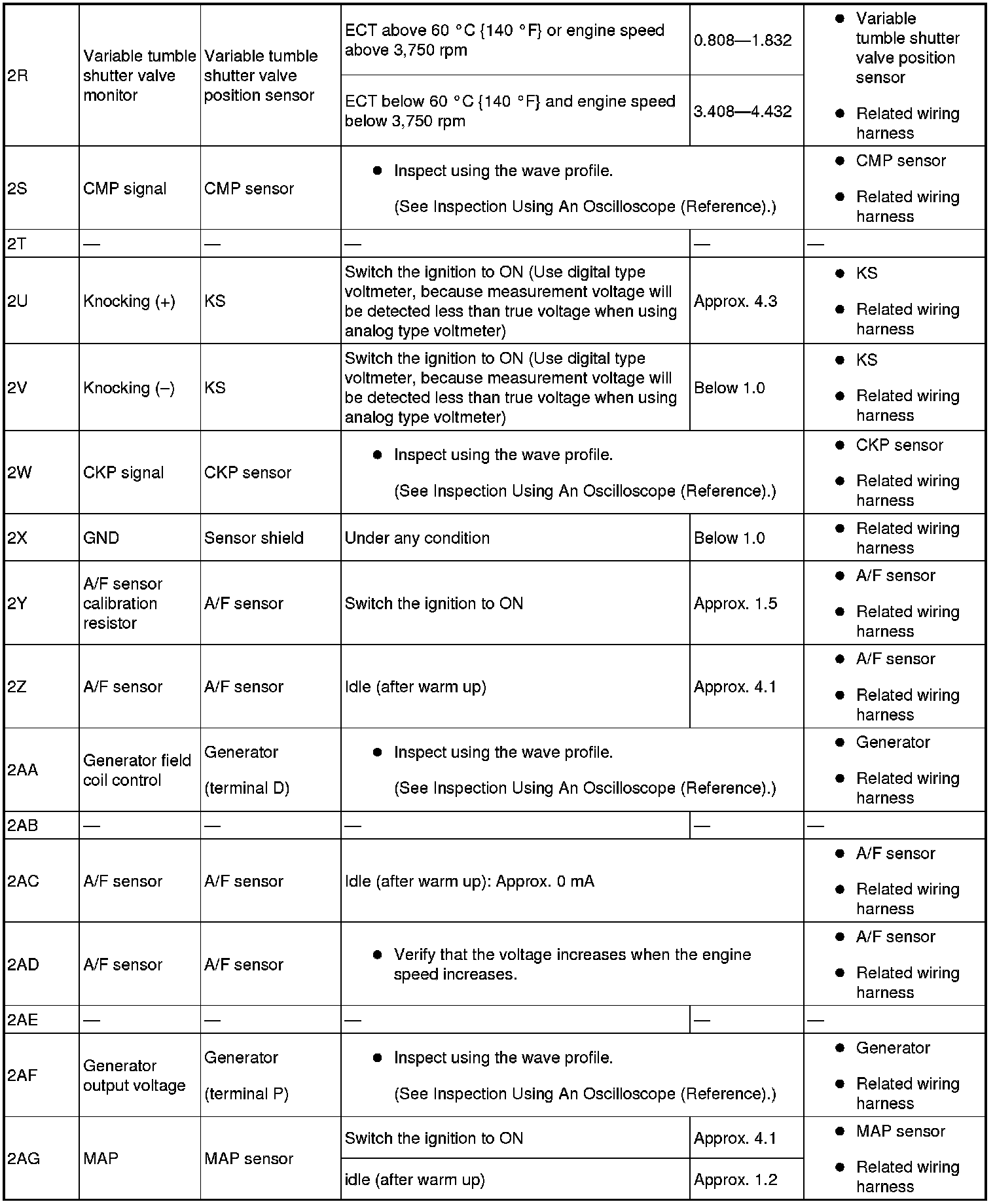 - The PCM terminal voltages vary with change in measuring conditions and vehicle conditions. Always carry out a total inspection of the input systems, output systems, and PCM to determine the cause of trouble. Otherwise, a wrong diagnosis will be made.